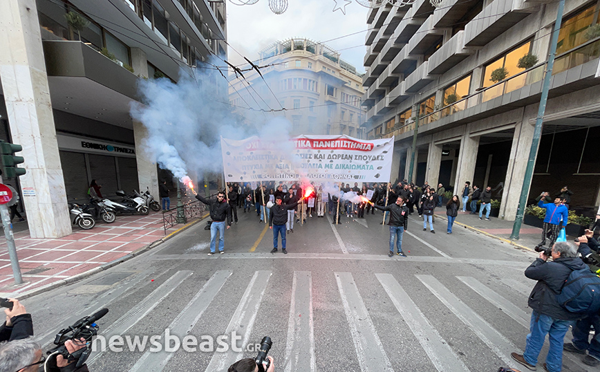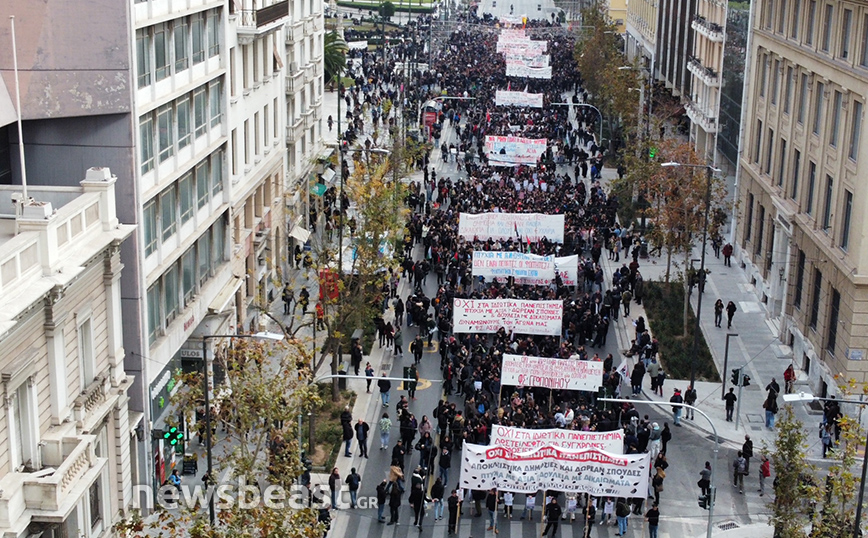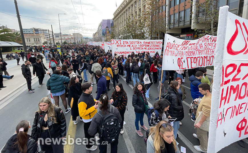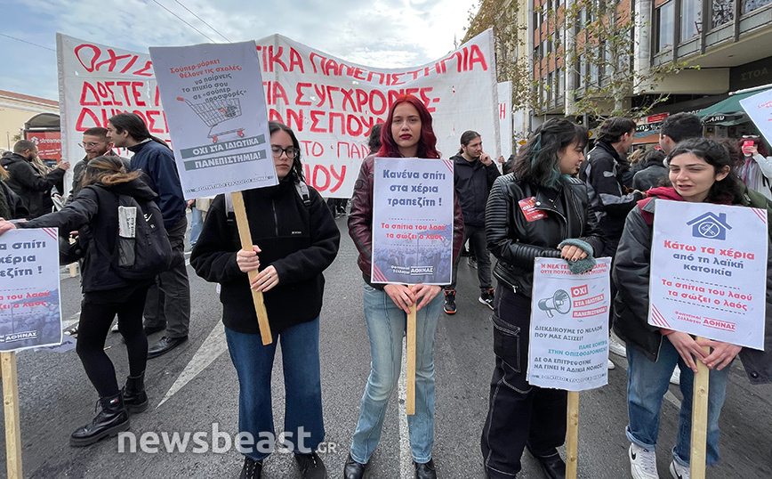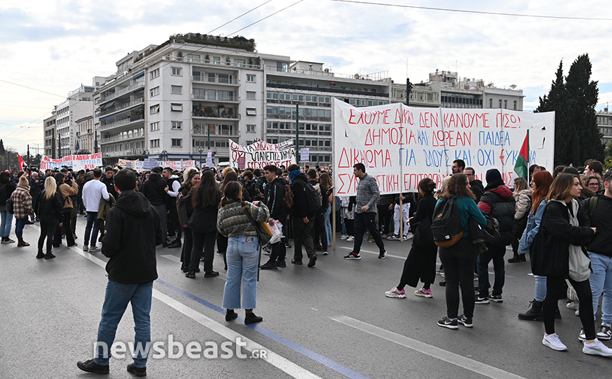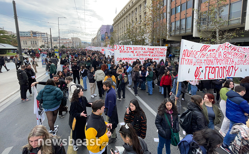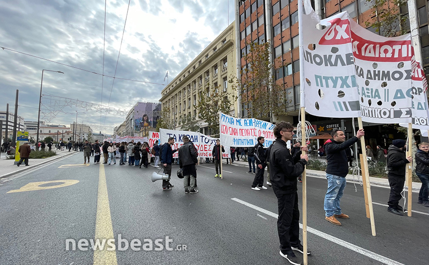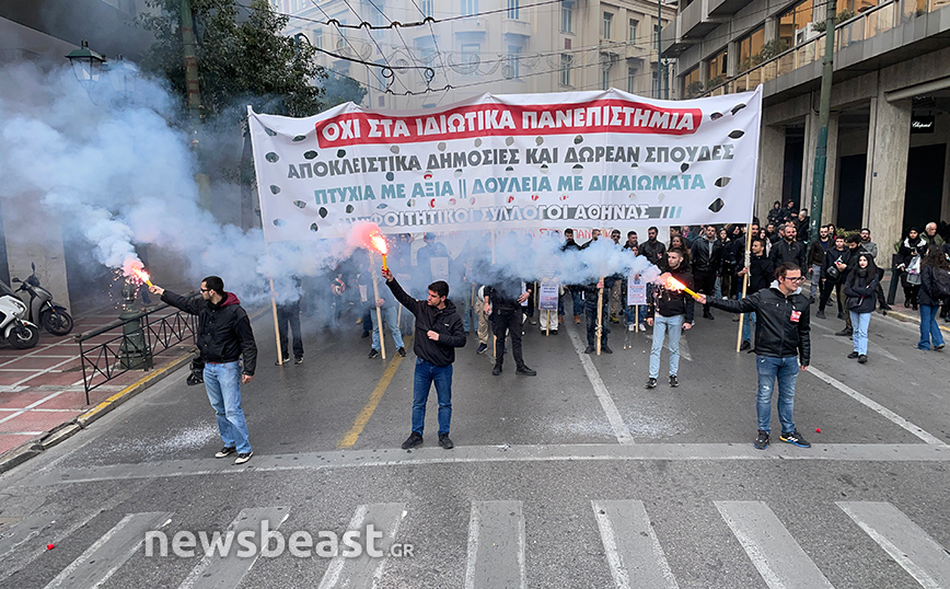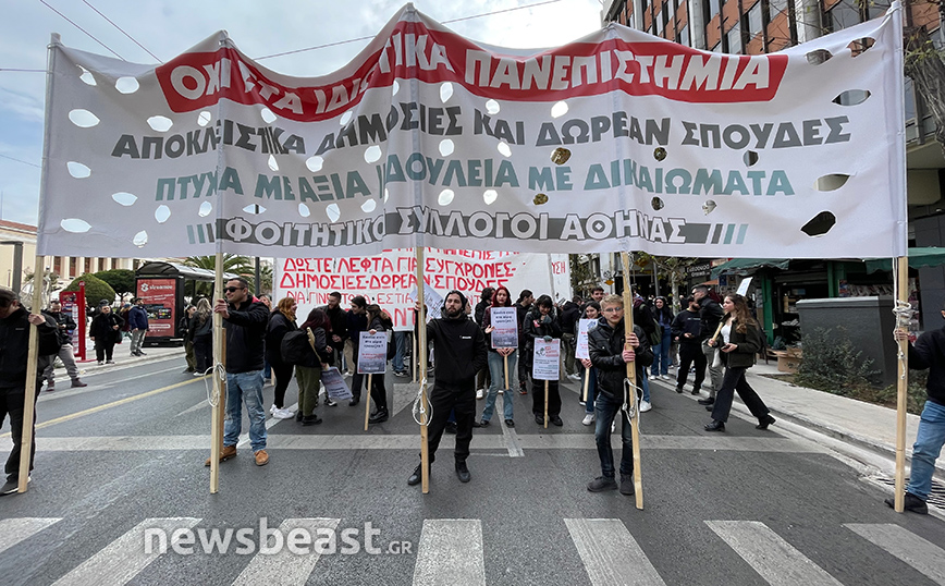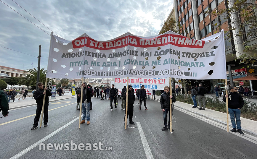 Με πανό που γράφει «Όχι στα ιδιωτικά πανεπιστήμια, αποκλειστικά δημόσιες και δωρεάν σπουδές, πτυχία με αξία, δουλειά με δικαιώματα», οι φοιτητικοί σύλλογοι της Αθήνας συμμετέχουν ενεργά στο συλλαλητήριο.