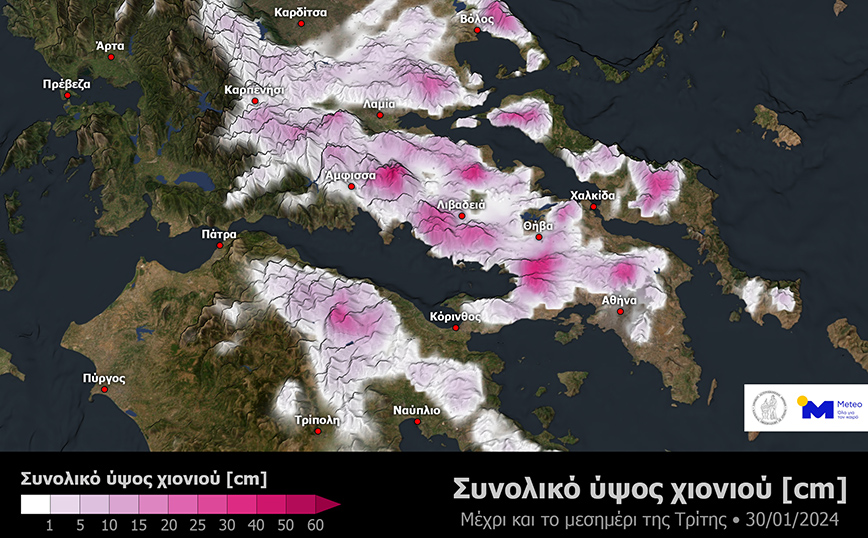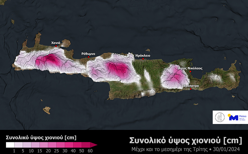 Το meteo παρουσιάζει τους προγνωστικούς χάρτες με τα εκτιμώμενα αθροιστικά ύψη χιονιού στα ανατολικά ηπειρωτικά και στην Κρήτη μέχρι τις μεσημεριανές ώρες της Τρίτης 30/01.