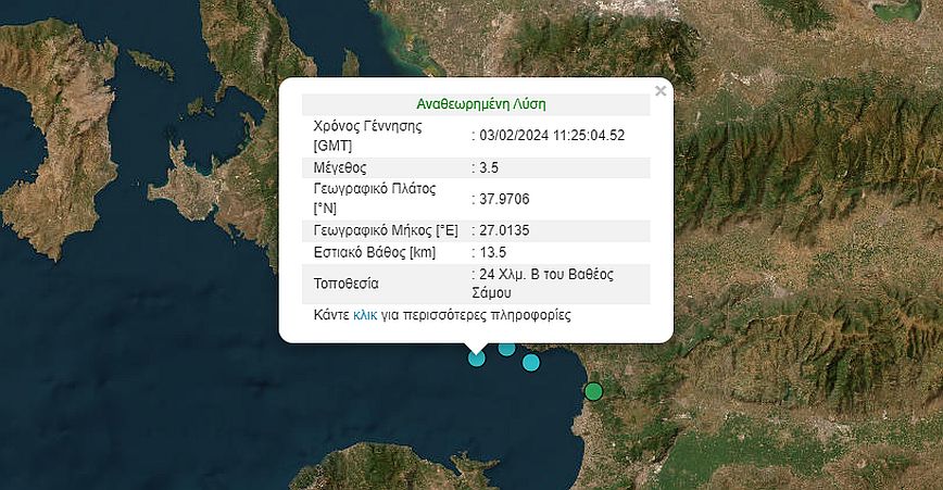 Σεισμική δόνηση μεγέθους 3,5 βαθμών της κλίμακας Ρίχτερ σημειώθηκε τα μεσημέρι του Σαββάτου στη θαλάσσια περιοχή βόρεια της Σάμου, σύμφωνα με το Γεωδυναμικό Ινστιτούτο του Εθνικού Αστεροσκοπείου Αθηνών.