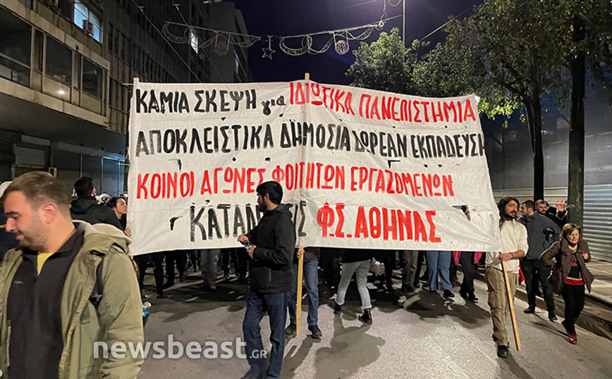 «Καμία σκέψη για ιδιωτικά πανεπιστήμια, αποκλειστικά δημόσια δωρεάν εκπαίδευση» γράφει το πανό που κρατούν οι φοιτητές που συμμετέχουν στο συλλαλητήριο.