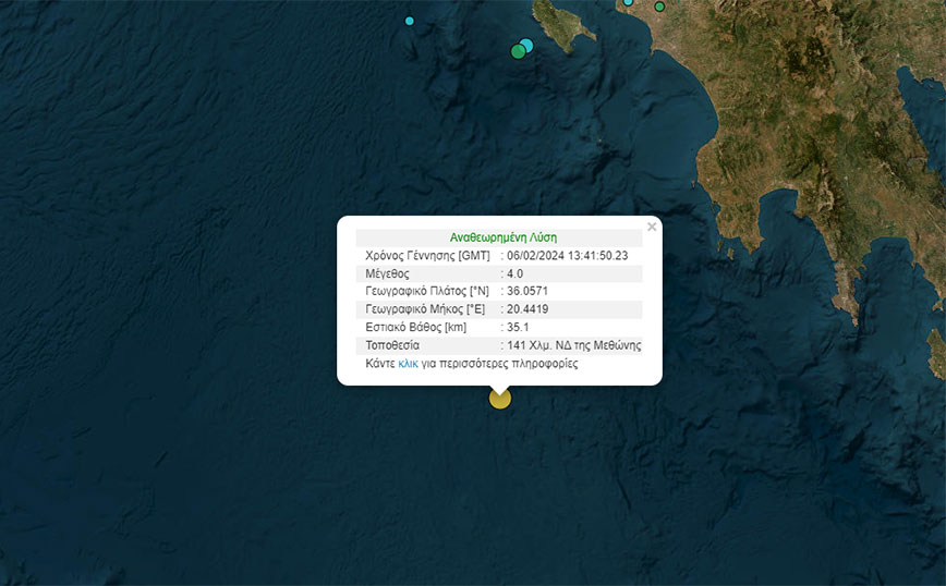 Σύμφωνα με την αναθεωρημένη λύση του Γεωδυναμικού Ινστιτούτου, η σεισμική δόνηση καταγράφηκε στα 141 χιλιόμετρα νοτιοδυτικά της Μεθώνης, με το εστιακό βάθος να εντοπίζεται στα 35,1 χιλιόμετρα.