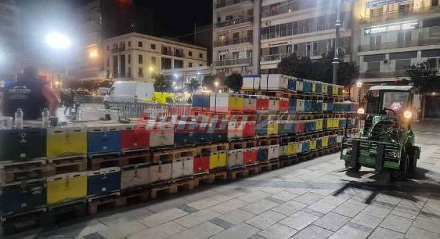 Στην πλατεία Γεωργίου έστησαν απόψε άδειες κυψέλες, τις οποίες σκοπεύουν να αφήσουν εκεί για ημέρες.