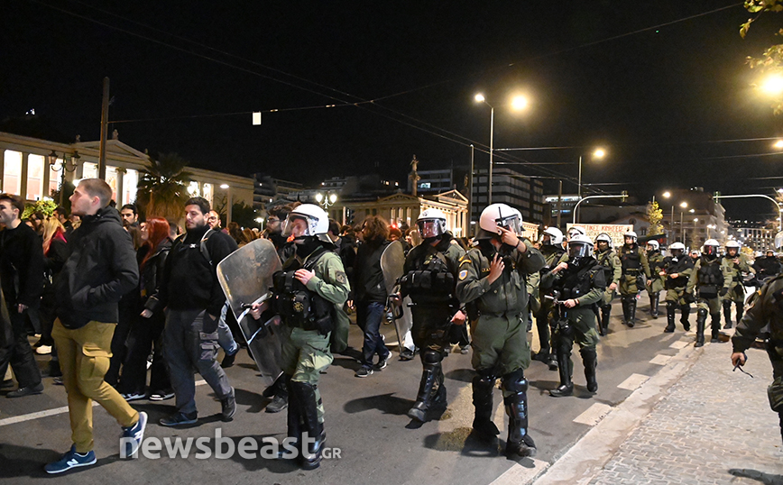 Κλειστή παραμένει η Πανεπιστημίου εξαιτίας της πορείας η οποία επιτηρείται από ισχυρές δυνάμεις της αστυνομίας.