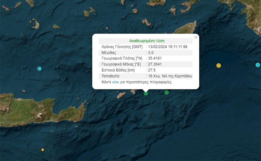Σύμφωνα με το Γεωδυναμικό Ινστιτούτο, η σεισμική δόνηση είχε επίκεντρο 16 χιλιόμετρα νοτιοανατολικά της Καρπάθου ενώ το εστιακό βάθος εντοπίζεται στα 27,5 χιλιόμετρα.