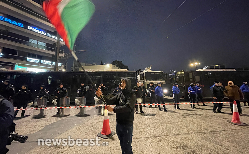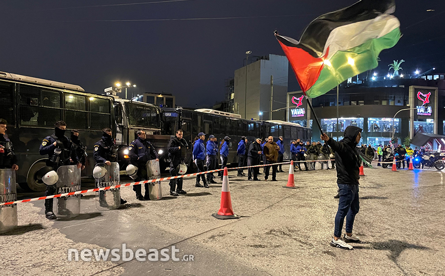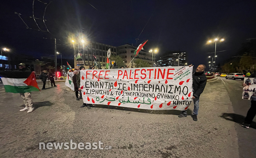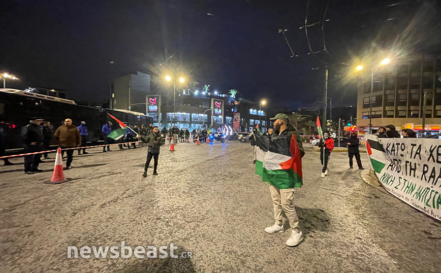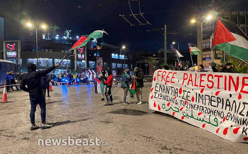 Σε εξέλιξη βρίσκεται συγκέντρωση αλληλεγγύης στην Παλαιστίνη και «καταδίκης της νέας σφαγής στη Ράφα» έξω από την πρεσβεία του Ισραήλ.
