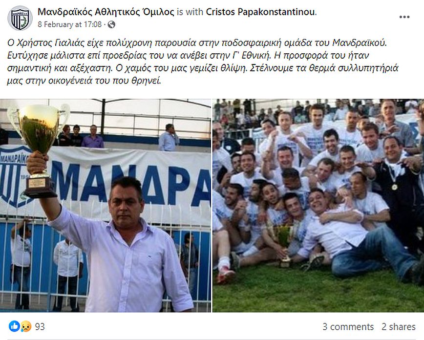 «Ο Χρήστος Γιαλιάς είχε πολύχρονη παρουσία στην ποδοσφαιρική ομάδα του Μανδραϊκού. Ευτύχησε μάλιστα επί προεδρίας του να ανέβει στην Γ’ Εθνική. Η προσφορά του ήταν σημαντική και αξέχαστη. Ο χαμός του μας γεμίζει θλίψη. Στέλνουμε τα θερμά συλλυπητήριά μας στην οικογένειά του που θρηνεί» ανέφερε η ανακοίνωση.