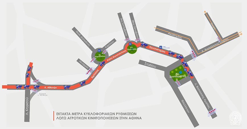 Προσωρινή διακοπή της κυκλοφορίας κατά μήκος του δρομολογίου που θα ακολουθήσουν τα αγροτικά οχήματα: Λεωφόρος Αθηνών, Αχιλλέως, πλατεία Καραϊσκάκη. Θα κινηθούν αντίθετα στην οδό Αγίου Κωνσταντίνου, την πλατεία Ομονοίας και την οδό Πανεπιστημίου, προκειμένου να φθάσουν στο Σύνταγμα. Θα υπάρξει προσωρινή διακοπή της κυκλοφορίας πέριξ της πλατείας Ομονοίας.
