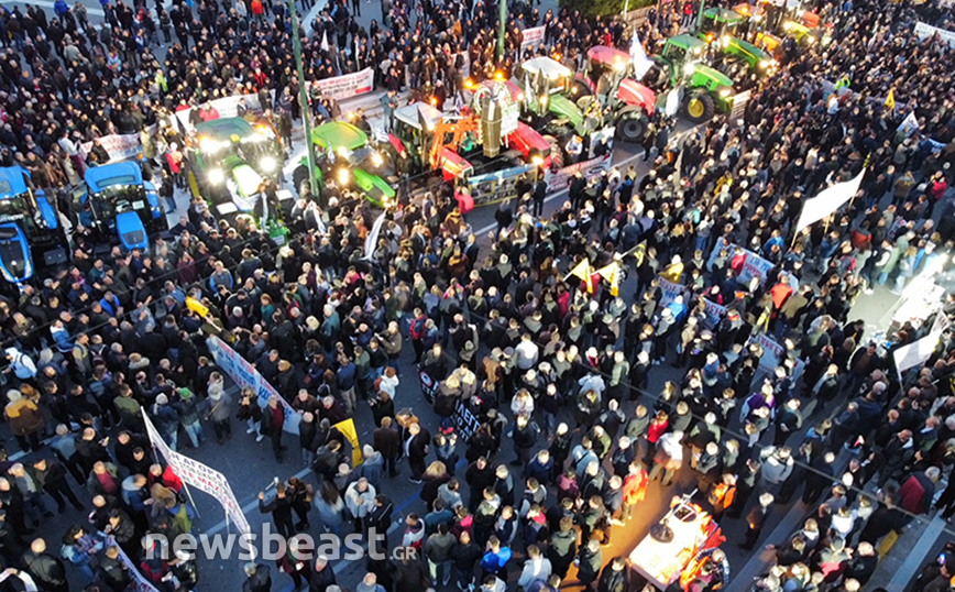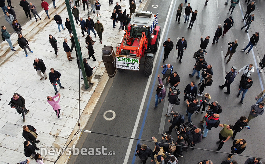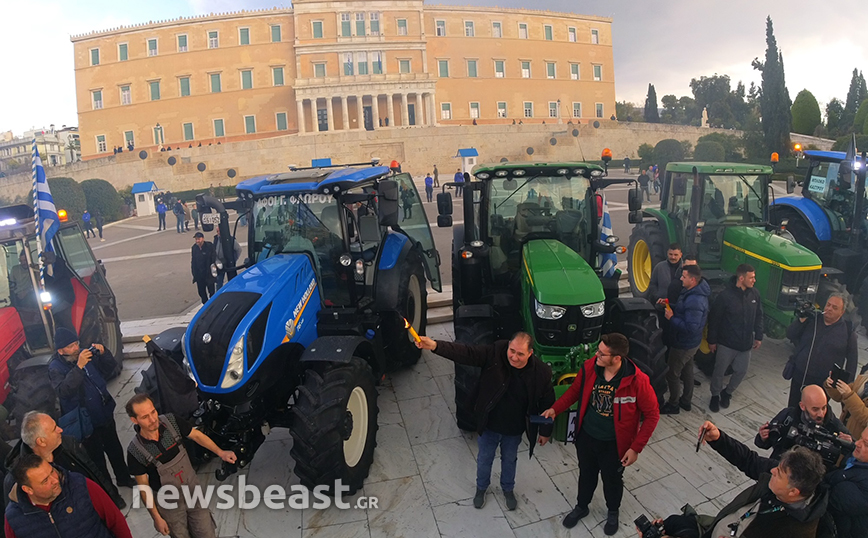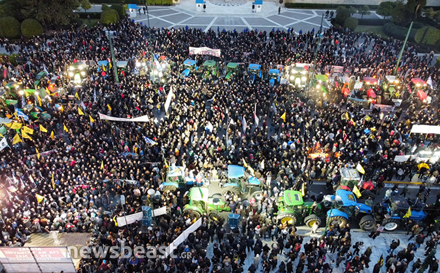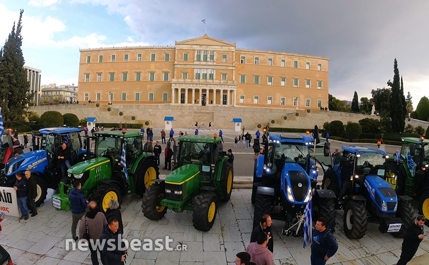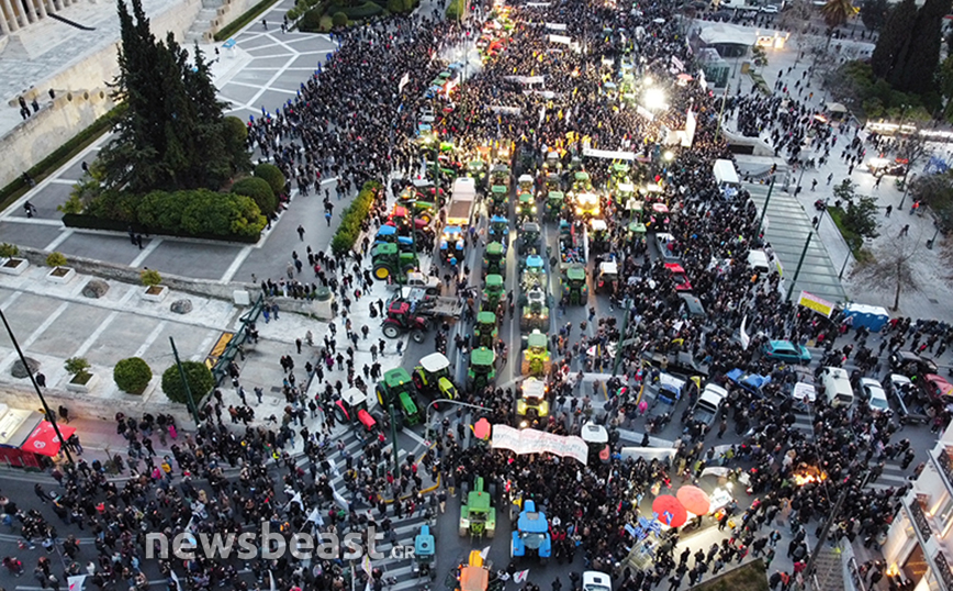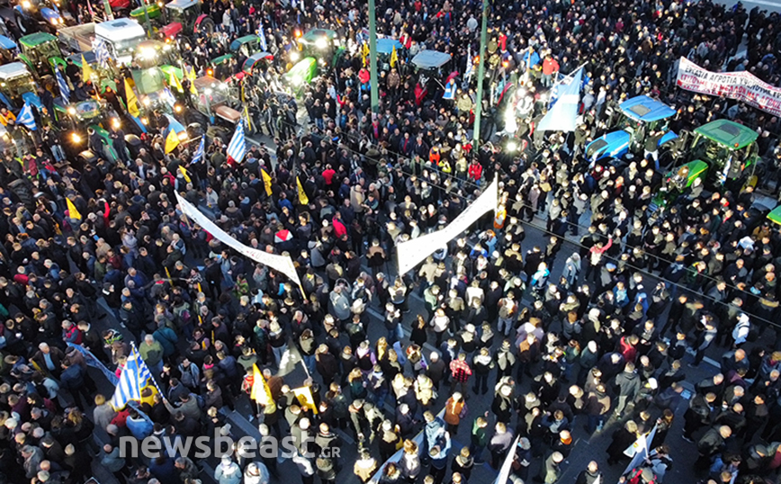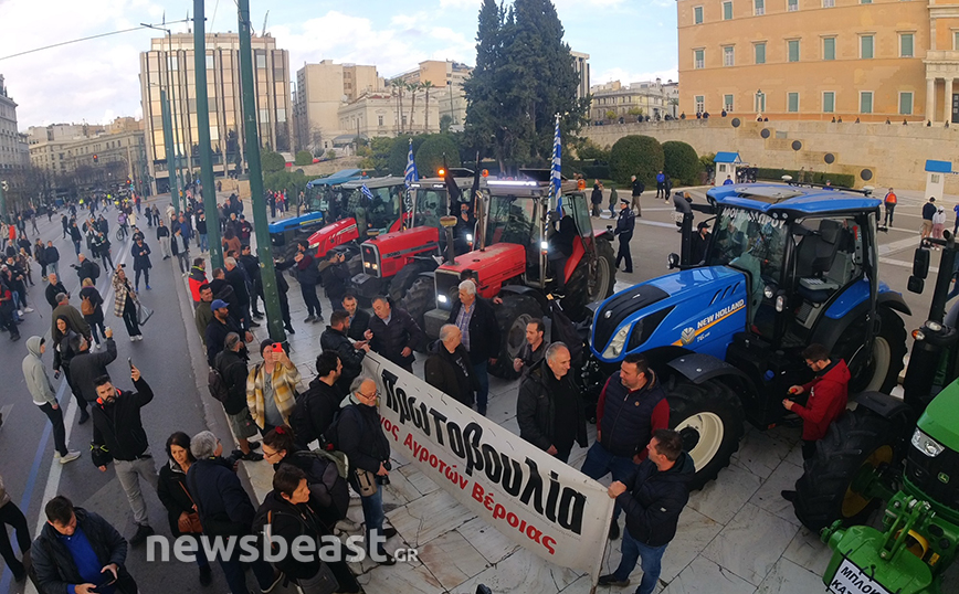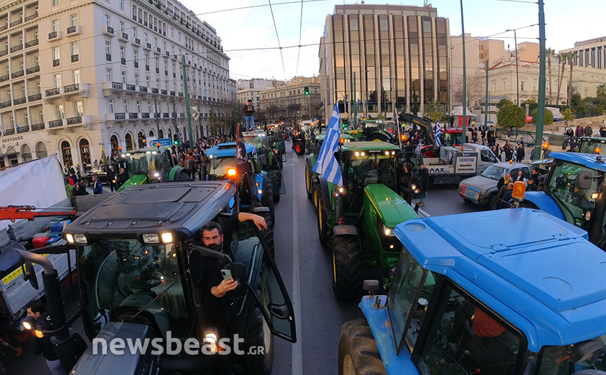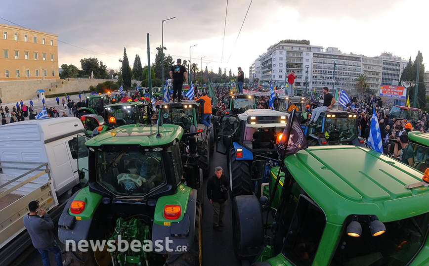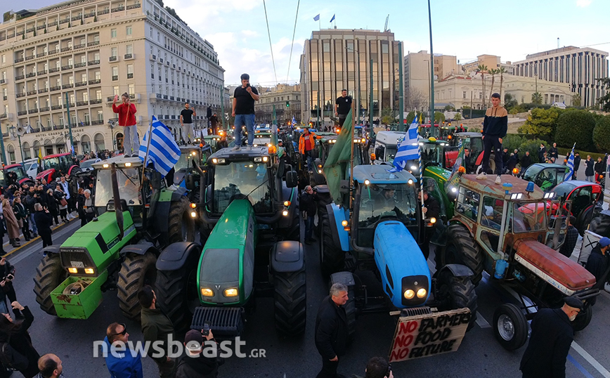 Μπροστά από το Κοινοβούλιο, η Λεωφόρος Βασιλίσσης Σοφίας είναι γεμάτη από τρακτέρ και επαγγελματικά οχήματα και ο κόσμος πολύς, αφού στους διαδηλωτές έχουν προστεθεί ομοσπονδίες, σωματεία και συνδικάτα εργαζομένων από δεκάδες τομείς, που βρίσκονται στο Σύνταγμα για να συμπαρασταθούν στους αγρότες, τους οποίους υποδέχτηκαν με το σύνθημα: «Εργατιά, αγροτιά ενωμένοι μια γροθιά».