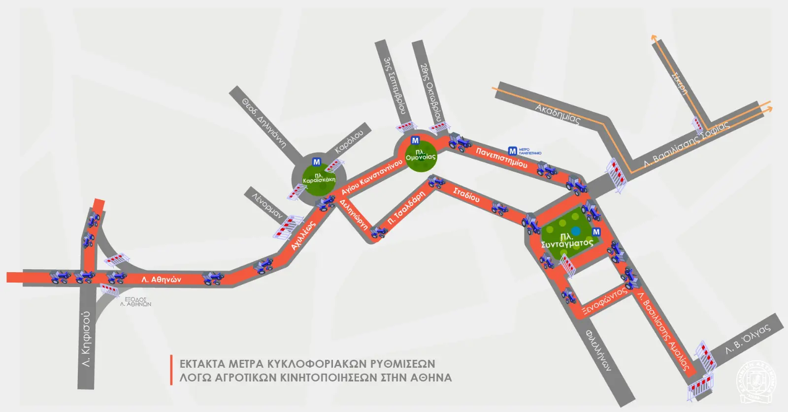 - Προσωρινή διακοπή της κυκλοφορίας κατά μήκος του δρομολογίου που θα ακολουθήσουν τα αγροτικά οχήματα: λεωφόρος Αθηνών, Αχιλλέως, πλατεία Καραϊσκάκη. Θα κινηθούν αντίθετα στην οδό Αγίου Κωνσταντίνου, την πλατεία Ομονοίας και την οδό Πανεπιστημίου, προκειμένου να φτάσουν στο Σύνταγμα. Θα υπάρξει προσωρινή διακοπή της κυκλοφορίας πέριξ της πλατείας Ομονοίας.