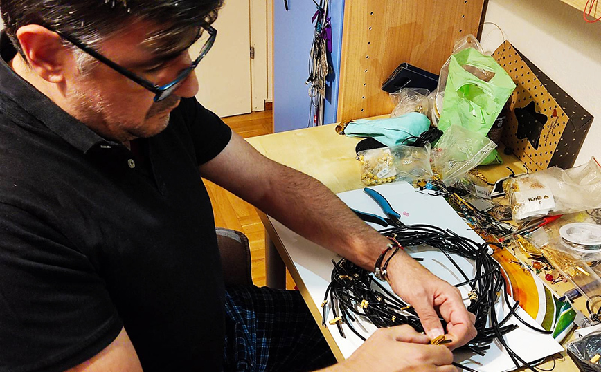 Τα κοσμήματά του είναι περίτεχνα και παραπέμπουν σε διάφορες εποχές της ελληνικής πολιτιστικής κληρονομιάς, ενώ έχουν πάνω τους το αποτύπωμα του σχεδιαστή και το μήνυμά του ότι η προσπάθεια δεν πρέπει να σταματά μπροστά σε κανένα εμπόδιο. Αυτό άλλωστε σκέφτεται κάθε φορά που πιάνει στα χέρια του το υλικό για να φτιάξει δαχτυλίδια, διακοσμητικά για το κεφάλι και λογής λογής άλλα κοσμήματα. Μάλιστα, όλα τα φτιάχνει με μόλις τρεις τανάλιες και τα χέρια του, αφού δεν μπορεί να χρησιμοποιήσει πολλά εργαλεία και μηχανήματα και το αποτέλεσμα στον λιτό χώρο του είναι εντυπωσιακό.