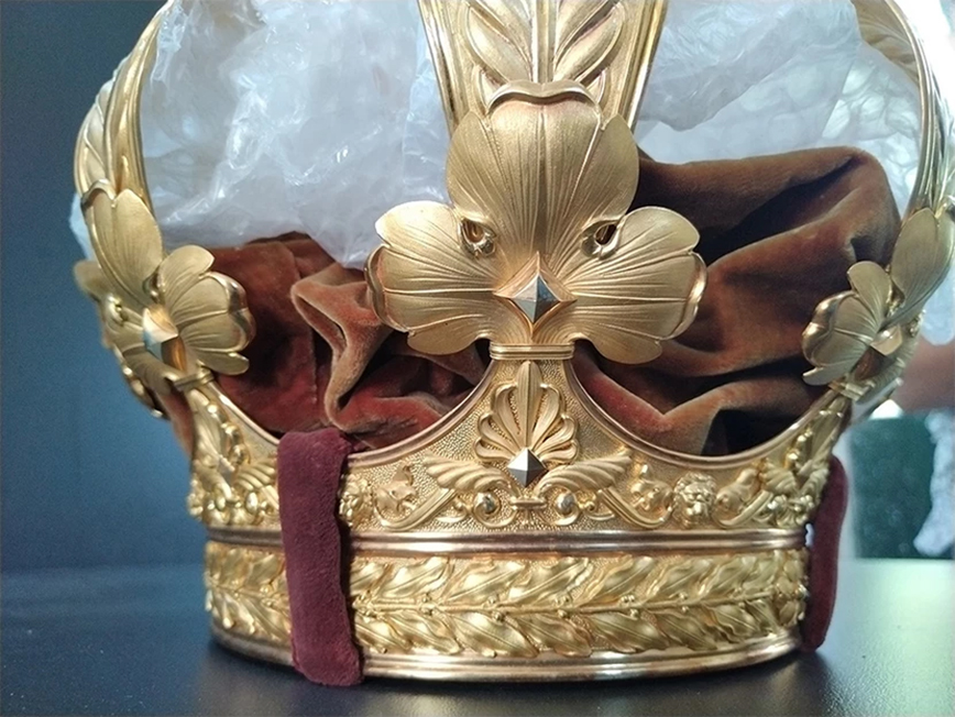 Το στέμμα φέρει στεφάνι διακοσμημένο με φυτική ταινία που παραπέμπει σε δάφνινο στεφάνι. Στο σημείο αυτό υπάρχει επίθετη επιγραφή με την υπογραφή του καλλιτέχνη. Από εκεί ξεκινάνε οκτώ τόξα, διακοσμημένα με αρχαιοπρεπή φύλλα άκανθας και λεοντοκεφαλές, από τα οποία φύονται αντίστοιχα οκτώ τοξωτά στελέχη σε σχήμα κλαδιών φοίνικα. Η όλη σύνθεση ενώνεται στο κέντρο όπου σχηματίζεται η επίστεψη του στέμματος με την υδρόγειο σφαίρα, κάτω από τον σταυρό. Στο εσωτερικό διατηρείται το πορφυρό βελούδο, αλλά παρουσιάζει εκτεταμένες φθορές.