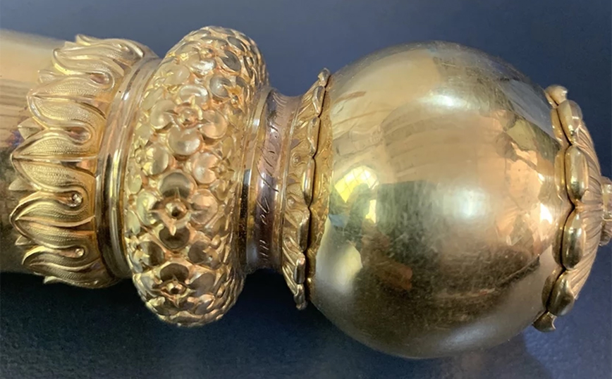 Υλικό: Χρυσός και επιχρυσωμένο μέταλλο, σμάλτο, βελούδο. Διαστάσεις: Ύψος 25 εκ., Μέγ. Διάμετρος 29 εκ.