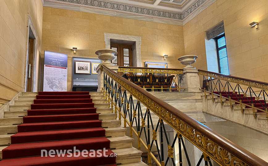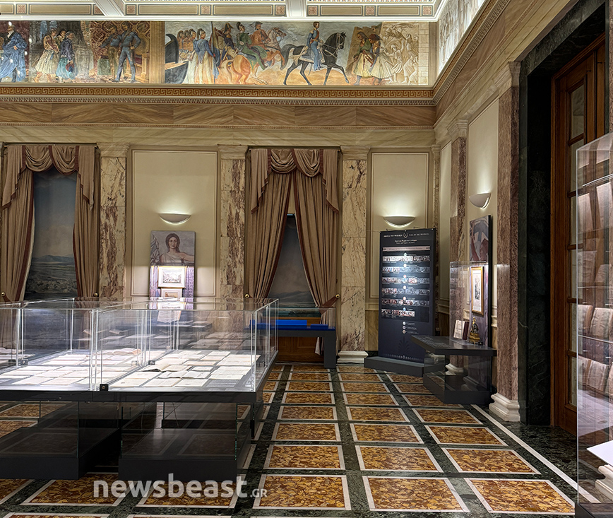 Μάλιστα είναι χαρακτηριστικό το γεγονός ότι το πάνω μέρος της συγκεκριμένης αίθουσας καλύπτει μια υπέροχη ζωφόρος με ιστορικές στιγμές από την έναρξη της Επανάστασης έως τη συγκρότηση του ελληνικού κράτους και πως η προθήκη όπου θα τοποθετηθούν το στέμμα, το ξίφος και το σκήπτρο βρίσκεται ακριβώς κάτω από το τμήμα της ζωφόρου που αναπαριστά έφιππο τον βασιλιά Όθωνα.