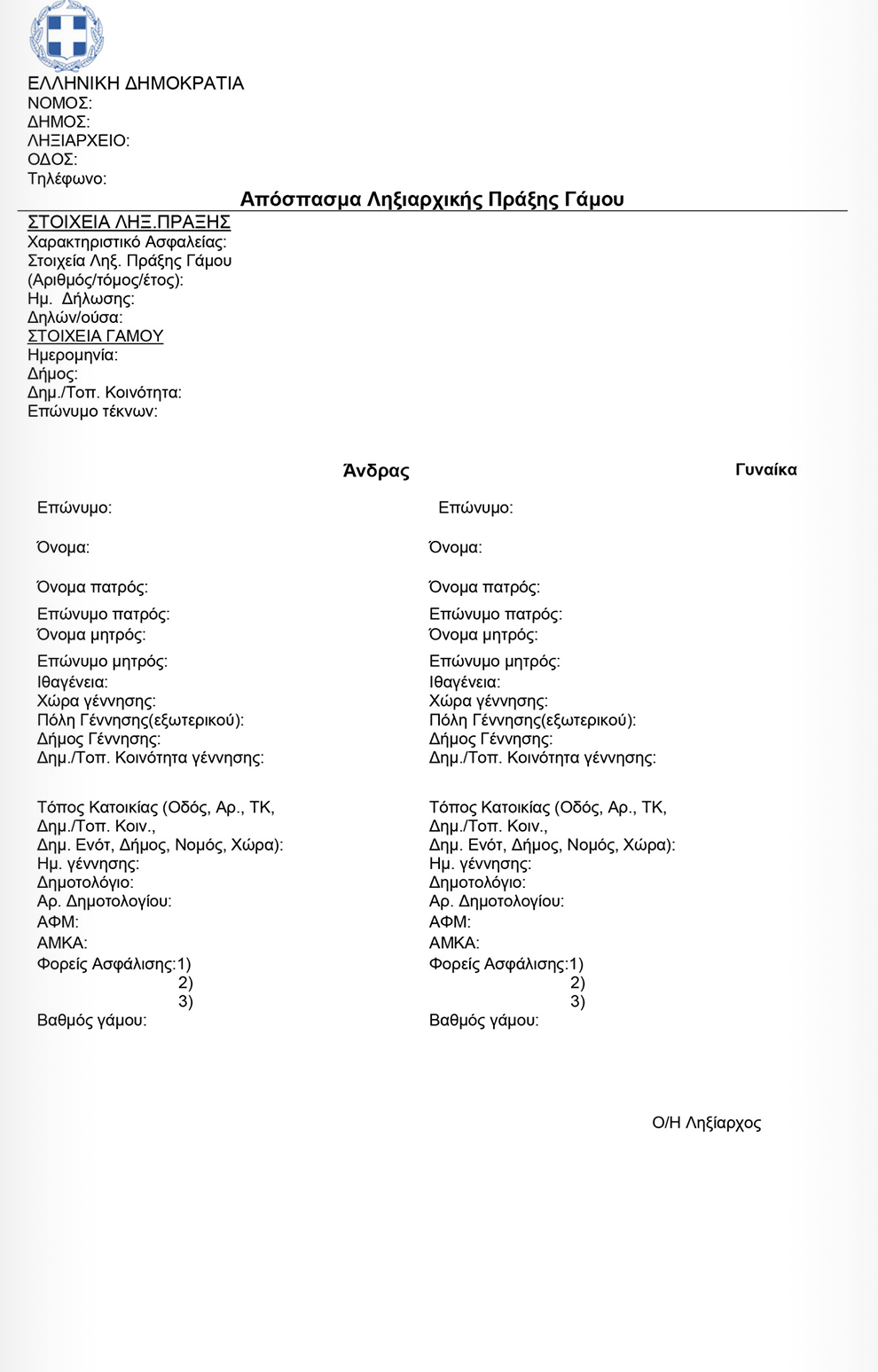 Ληξιαρχική πράξη γάμου άνδρα – γυναίκας