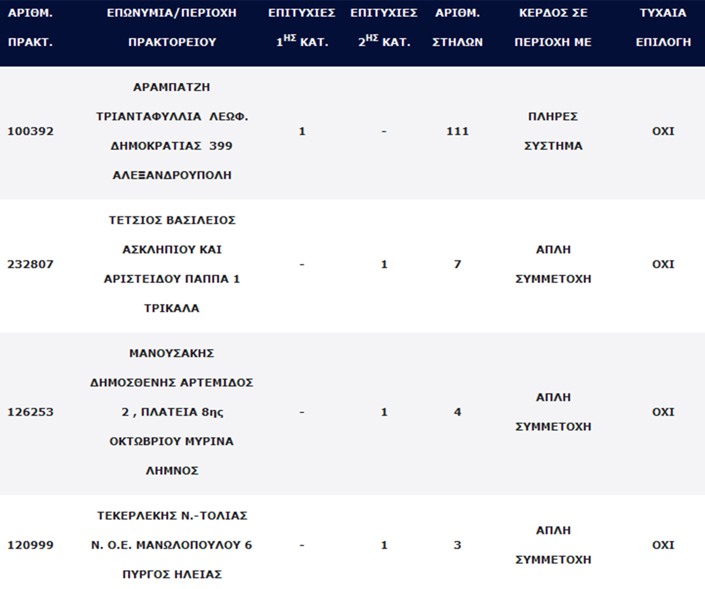 Σύμφωνα με την ανακοίνωση του ΟΠΑΠ, για τους 5+1 τυχερούς αριθμούς ο/η μεγάλος τυχερός συμπλήρωσε συνολικά 111 στήλες αξίας 111 ευρώ.