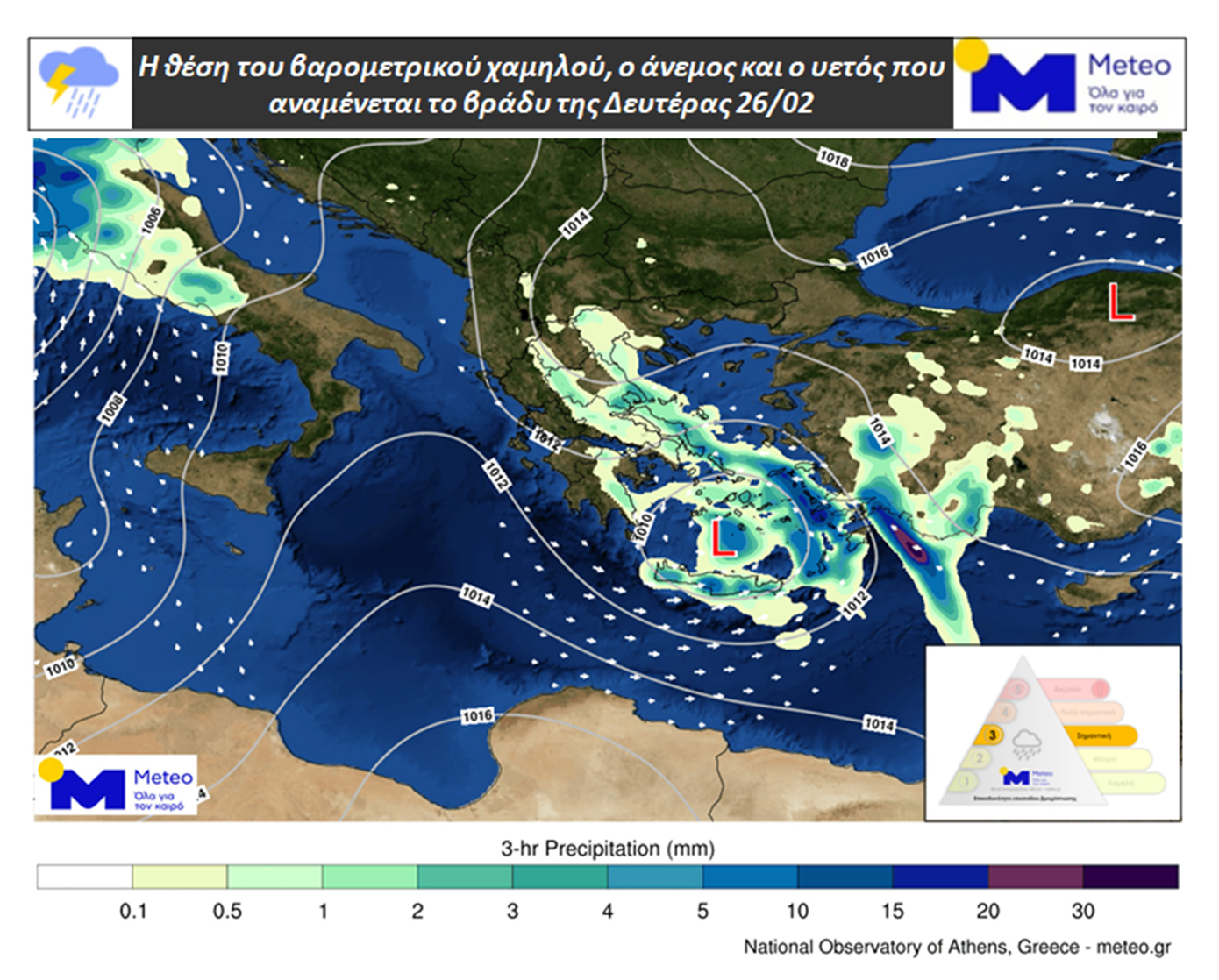 Από τα μεσάνυχτα της Κυριακής 25/2 έως τις 8 π.μ. της Δευτέρας 26/2, τα μεγαλύτερα ύψη βροχής σημειώθηκαν στην Πεζούλα Καρδίτσας (42 χιλιοστά), στην Σπάρτη (41), στα Ριζώματα Ημαθίας (40), στο Δίον Πιερίας (38), στο Γύθειο (38) και στους Μολάους Λακωνίας (38).