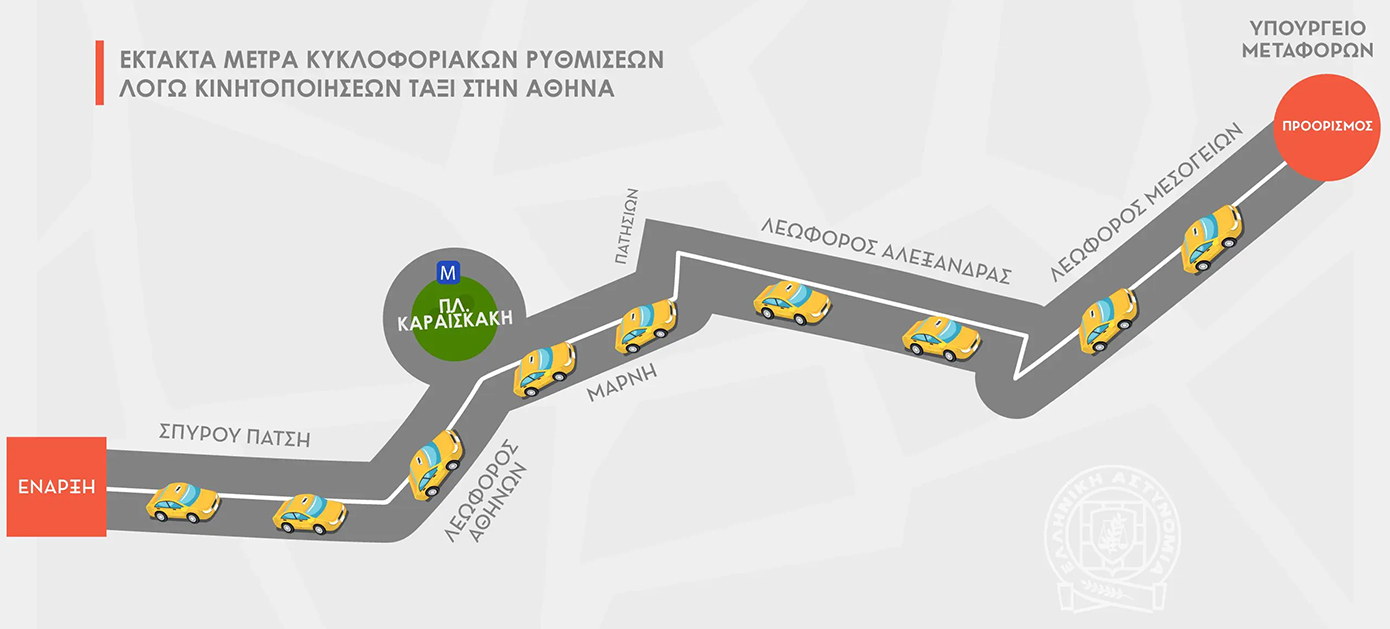 «Σας υπενθυμίζουμε ότι σήμερα, 27 Φεβρουαρίου και περί ώρα 10:00, οδηγοί ΤΑΞΙ θα πραγματοποιήσουν συγκέντρωση και στη συνέχεια αυτοκινητοπομπή με κατεύθυνση το Υπουργείο Υποδομών και Μεταφορών» επεσήμανε και τόνισε «στο πλαίσιο αυτό, η Ελληνική Αστυνομία θα λάβει μέτρα αποσυμφόρησης της κίνησης πραγματοποιώντας προσωρινές εκτροπές και διακοπές κυκλοφορίας, όπου είναι απαραίτητες, κατά το μήκος της διαδρομής».