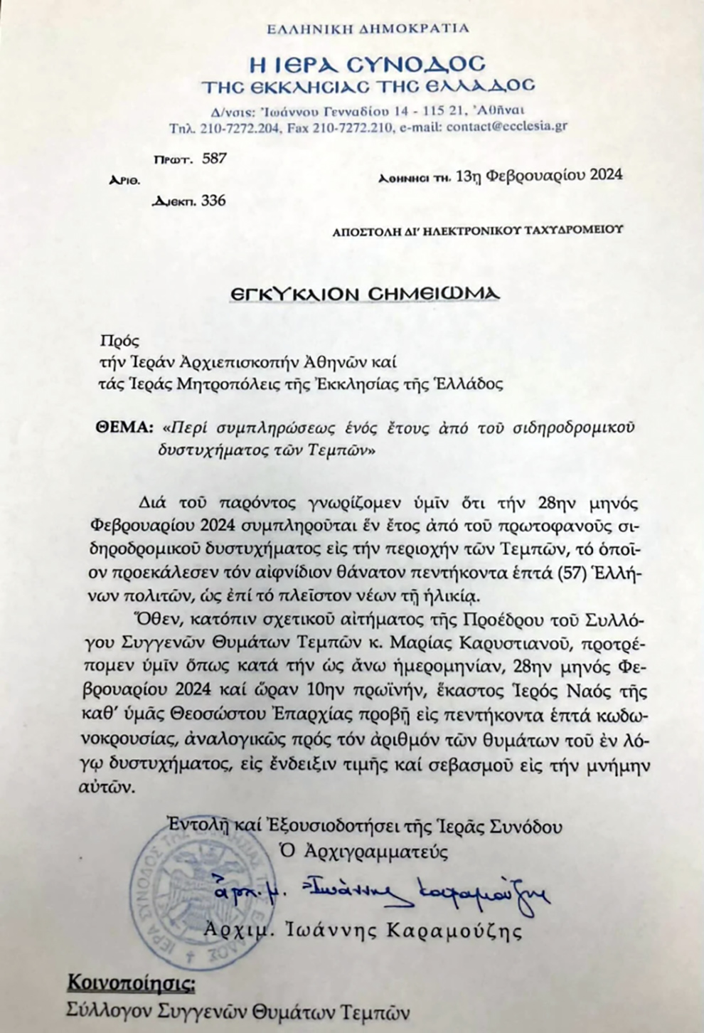 Σύμφωνα με την ΕΡΤ, το σχετικό αίτημα υπέβαλε η πρόεδρος του Συλλόγου Συγγενών Θυμάτων Τεμπών 2023, Μαρία Καρυστιανού, στην Ιερά Αρχιεπισκοπή Αθηνών και στις Ιερές Μητροπόλεις της Εκκλησίας της Ελλάδος.