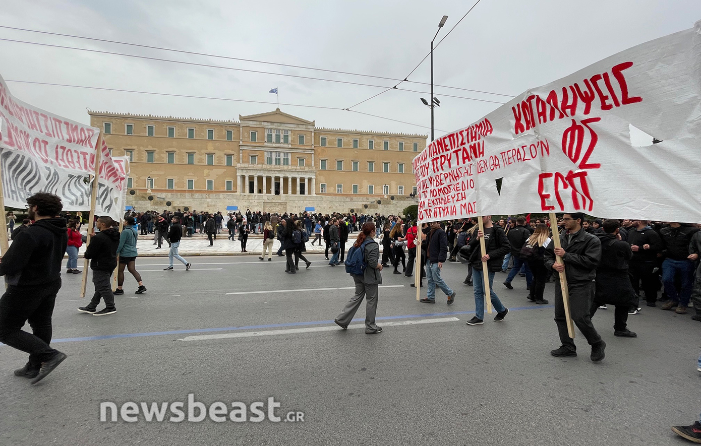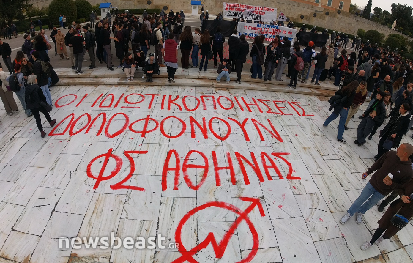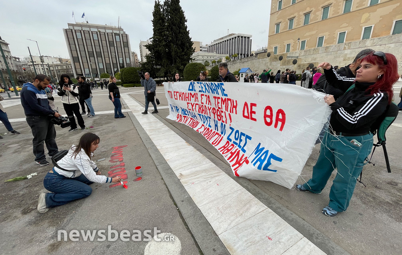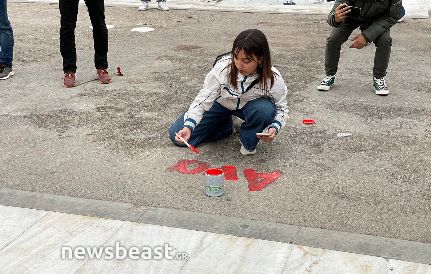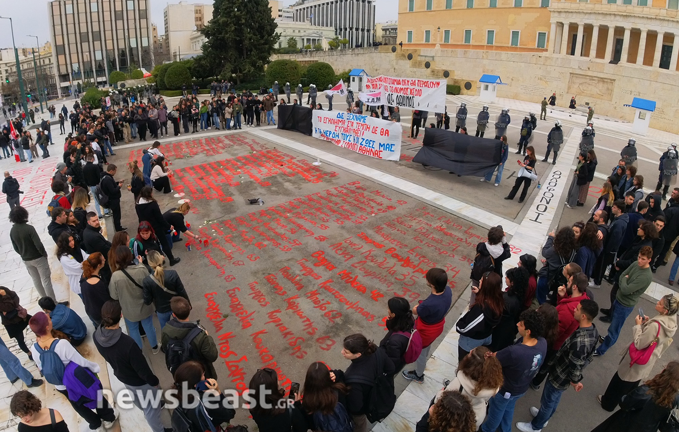 Τα ονόματα των 57 θυμάτων του δυστυχήματος των Τεμπών, που γράφτηκαν κατά τη διάρκεια της απεργιακής κινητοποίησης της Τετάρτης και σβήστηκαν από τα συνεργεία του Δήμου το βράδυ της ίδιας μέρας, προκαλώντας αναστάτωση και επικρίσεις, ξαναγράφονται από φοιτητές που πραγματοποιούν διαδήλωση ενάντια στα ιδιωτικά πανεπιστήμια.