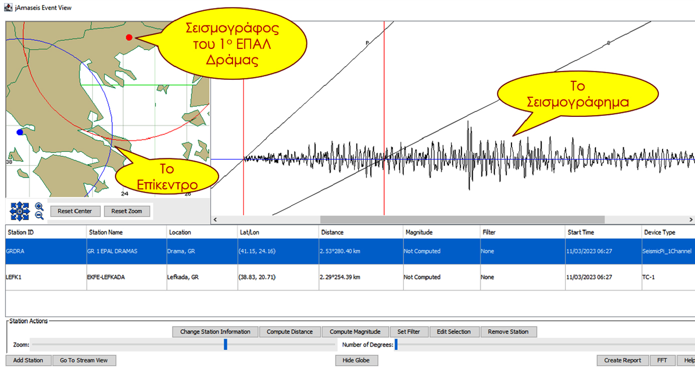 Αρχικά, στο σχολείο κατασκευάστηκε ένας σεισμογράφος που εγκαταστάθηκε στο εργαστήριο Φυσικών Επιστημών και χρησιμοποιείται για καθαρά εκπαιδευτικούς σκοπούς. Στη συνέχεια, τα παιδιά εξέφρασαν τη μεγάλη επιθυμία να κατασκευάσουν έναν ακόμη που θα μπορεί να είναι ενεργός, θα καταγράφει τη σεισμική δραστηριότητα και τα δεδομένα θα ανεβαίνουν στο διαδίκτυο ώστε να αξιοποιούνται από κάθε ενδιαφερόμενο. Ο δεύτερος τοποθετήθηκε στο ισόγειο του σχολείου και είναι συνδεδεμένος με την εφαρμογή – πλατφόρμα jAmaSeis. «Όλες οι καταγραφές της σεισμικής δραστηριότητας», εξηγεί, μιλώντας στο ΑΠΕ-ΜΠΕ, ο υπεύθυνος καθηγητής Σίμος Σαχινίδης, «δίνουν δεδομένα στο διαδίκτυο, τα οποία μπορεί να τα αξιοποιήσει ο καθένας. Έτσι, όπως εμείς αξιοποιούμε τις καταγραφές άλλων σεισμογράφων ώστε να μπορέσουμε να εντοπίσουμε το επίκεντρο ενός σεισμού, έτσι χρησιμοποιούνται και τα δεδομένα του δικού μας σεισμογράφου από άλλους. Πρέπει να σημειωθεί ότι εκτός της δικής μας καταγραφής απαιτούνται και δύο ακόμη καταγραφές από άλλους σεισμογράφους, ώστε η τομή των τριών κύκλων να μας δώσει το επίκεντρο του σεισμού και την ανάλυση της κυματομορφής, τα Ρίχτερ. Πρόσφατα, ο σεισμογράφος μας κατέγραψε τους σεισμούς που έγιναν στην Τουρκία και στο Καζακστάν».