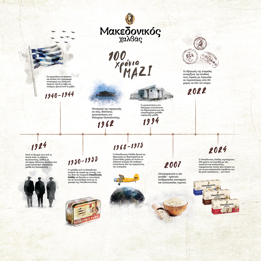 Τέλος, ο Μακεδονικός Χαλβάς προτρέπει τους καταναλωτές να επισκεφθούν το microsite 100xroniamazi.gr για να μάθουν τη σπουδαία ιστορία των 100 χρόνων του, καθώς και για να συμμετέχουν σε διαγωνισμό με δώρο αγαπημένα προϊόντα.