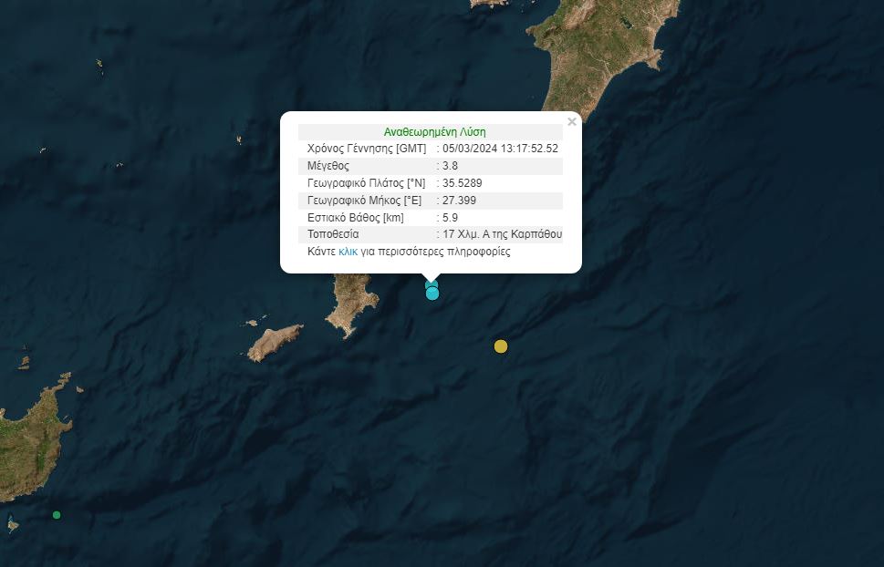Σεισμός 3,8 βαθμών της κλίμακας Ρίχτερ σημειώθηκε στις 15:17 το μεσημέρι της Τρίτης (05/03) στην Κάρπαθο.