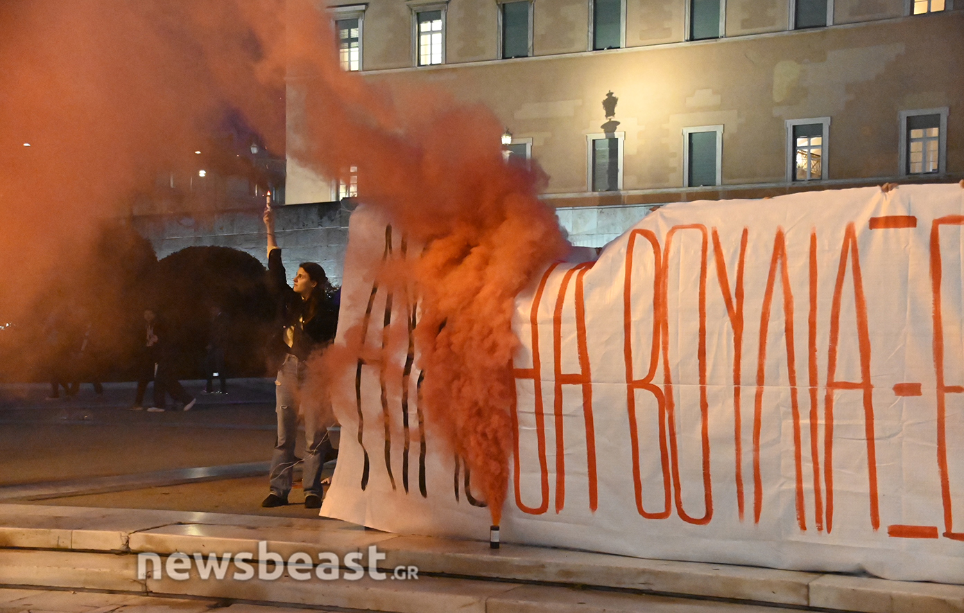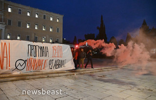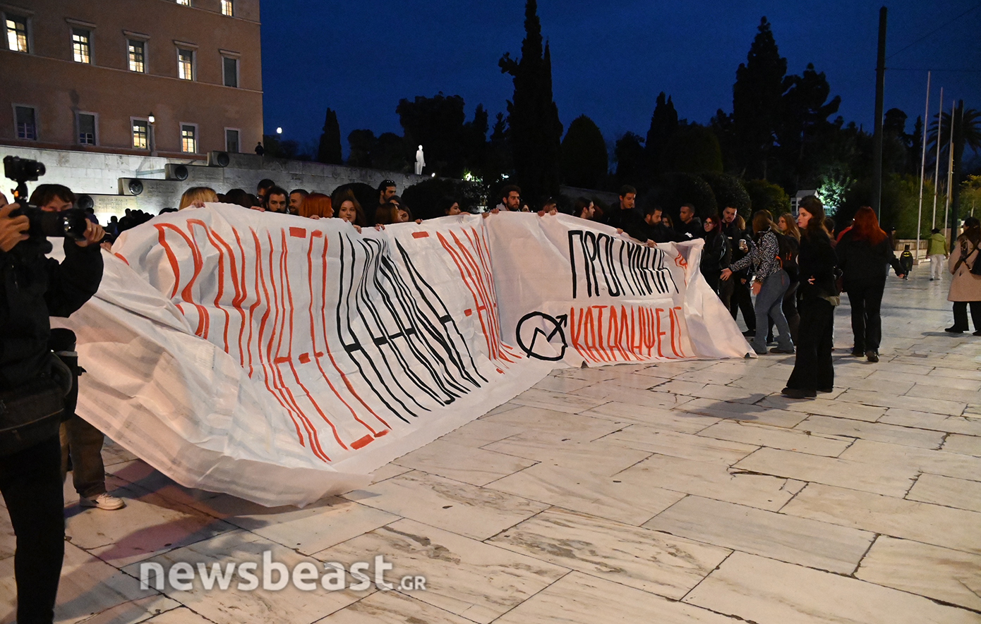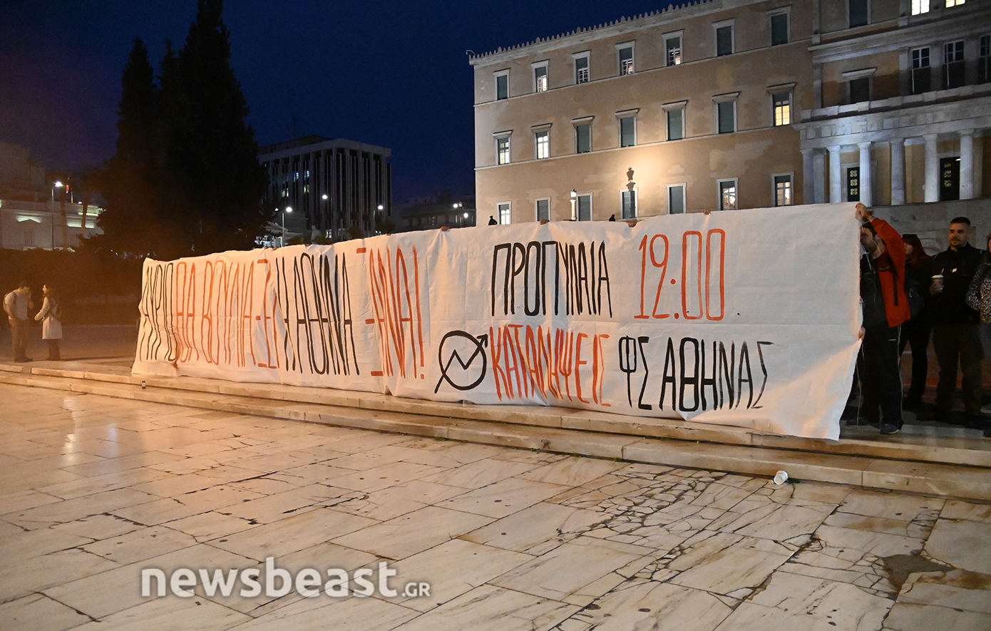 Πανό με το οποίο καλούν «να βουλιάξει η Αθήνα» σήκωσαν φοιτητές έξω από τη Βουλή, υπενθυμίζοντας έτσι το πανεκπαιδευτικό, πανελλαδικό συλλαλητήριο που είναι προγραμματισμένο για την Παρασκευή για να μην ψηφιστεί το νομοσχέδιο της κυβέρνησης.