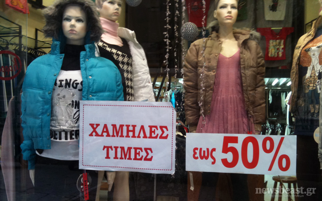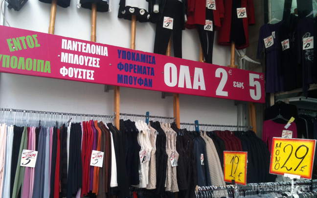 Η κυρία Αγγελική έχει κατάστημα στην οδό Αιόλου στο κέντρο της Αθήνας. Πουλάει όσο όσο αλλά ο κόσμος δεν μπαίνει, όπως λέει στο newsbeast.gr, στο μαγαζί της. «Δείτε και μόνοι σας τους άδειους δρόμους. Ο κόσμος δεν έχει λεφτά να ψωνίσει. Βλέπετε ότι πουλάμε μπλούζες ακόμη και με 5 ευρώ αλλά όπως αντιλαμβάνεστε κάποιοι δεν έχουν να διαθέσουν ούτε αυτά τα χρήματα».