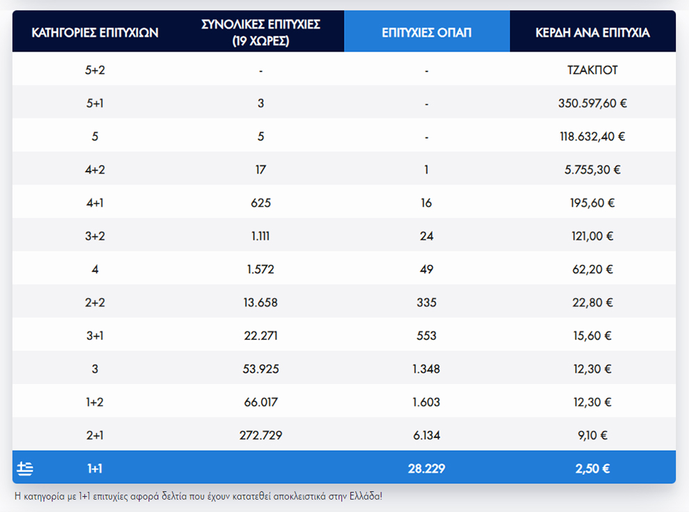 Το δελτίο του Eurojackpot περιλαμβάνει συνολικά 6 στήλες, με το κόστος κάθε μίας να ανέρχεται στα 2,5 ευρώ.