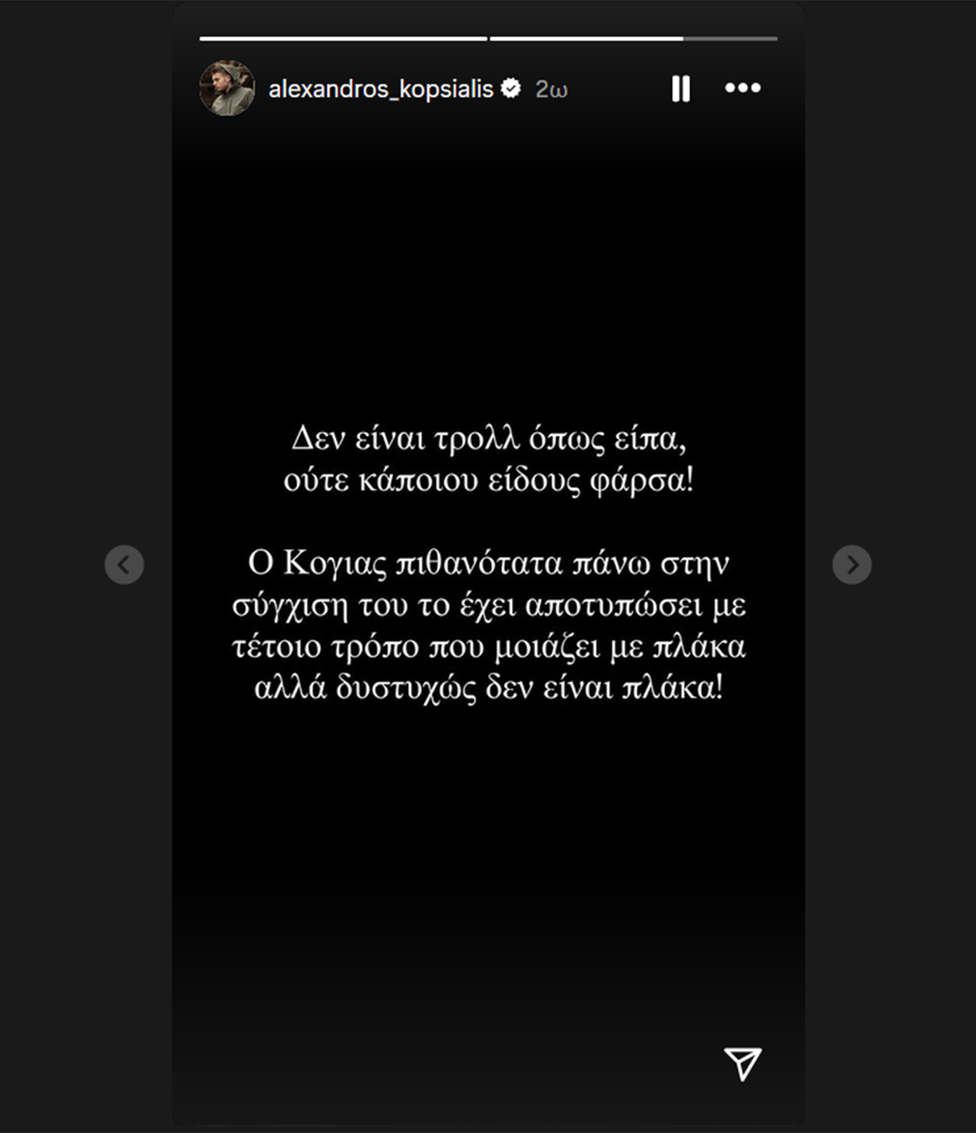 «Δεν είναι τρολ όπως είπα, ούτε κάποιου είδους φάρσα. Ο Κόγιας πιθανότατα πάνω στη σύγχυσή του το έχει αποτυπώσει με τέτοιο τρόπο που μοιάζει με πλάκα αλλά δυστυχώς δεν είναι πλάκα» ανέφερε χαρακτηριστικά ο Αλέξανδρος Κοψιάλης.