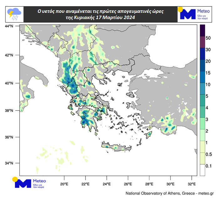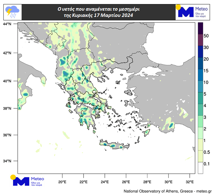 Στους χάρτες που ακολουθούν παρουσιάζεται ο υετός που αναμένεται το μεσημέρι και τις πρώτες απογευματινές ώρες της Κυριακής 17/03.