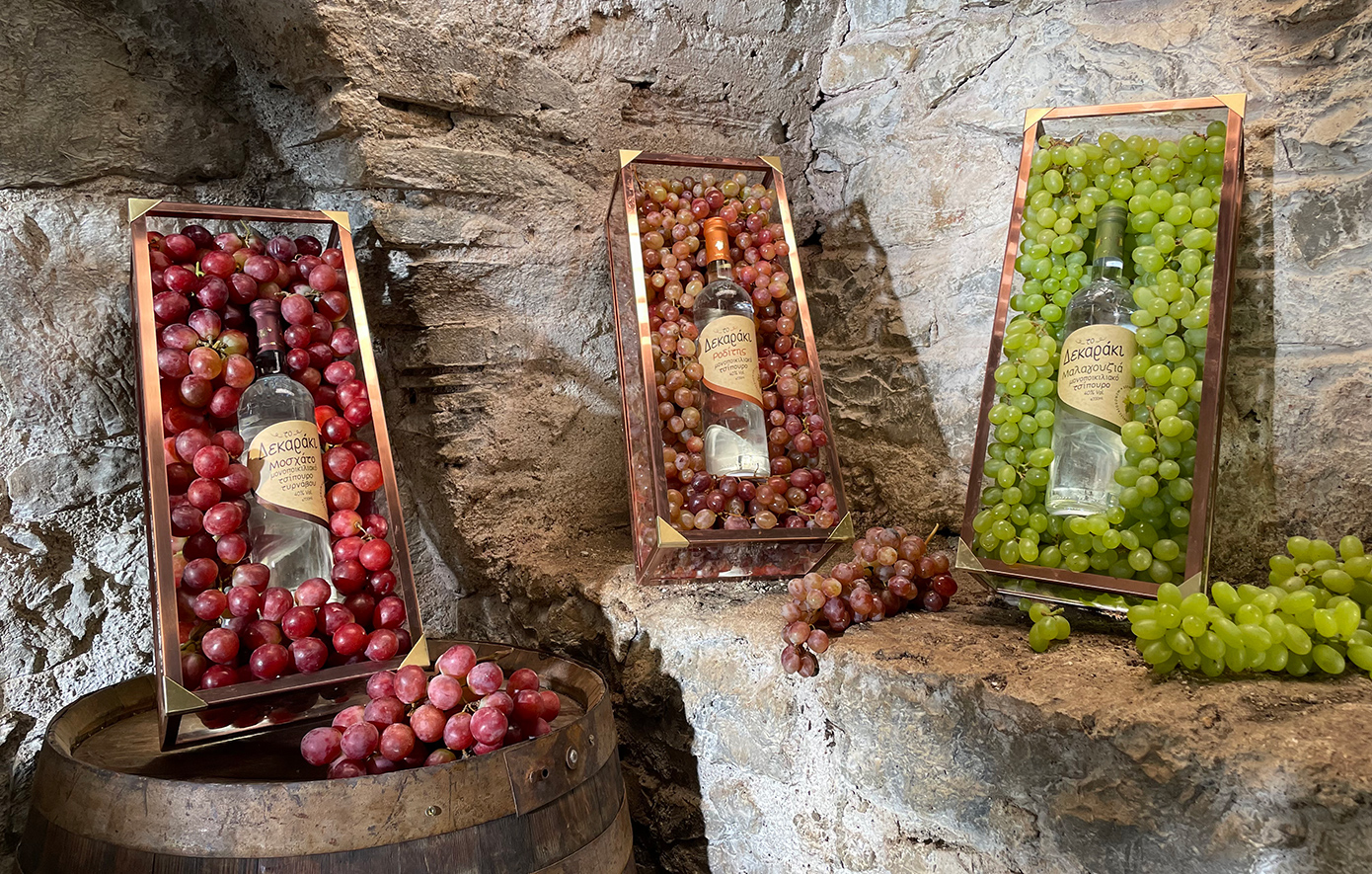 Το Δεκαράκι πρώτο απόσταξε και πρόσφερε την πρώτη οικογένεια μονοποικιλιακού τσίπουρου: το εκρηκτικό Μοσχάτο, την αρχοντική Μαλαγουζιά και τον αρμονικό Ροδίτη Αλεπού. Τα μονοποικιλιακά τσίπουρα Δεκαράκι, παράγονται χωρίς γλυκάνισο και με αλκοολικό βαθμό 40% Vol.