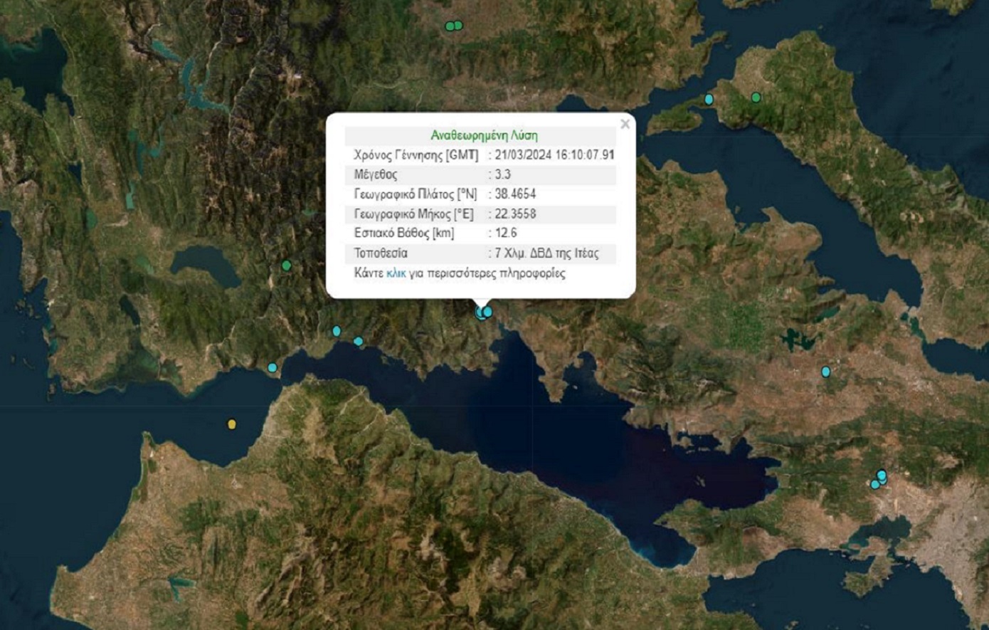 Σεισμική δόνηση μεγέθους 3,3 βαθμών της κλίμακας Ρίχτερ, σημειώθηκε το απόγευμα της Πέμπτης 21 Μαρτίου στην Ιτέα.