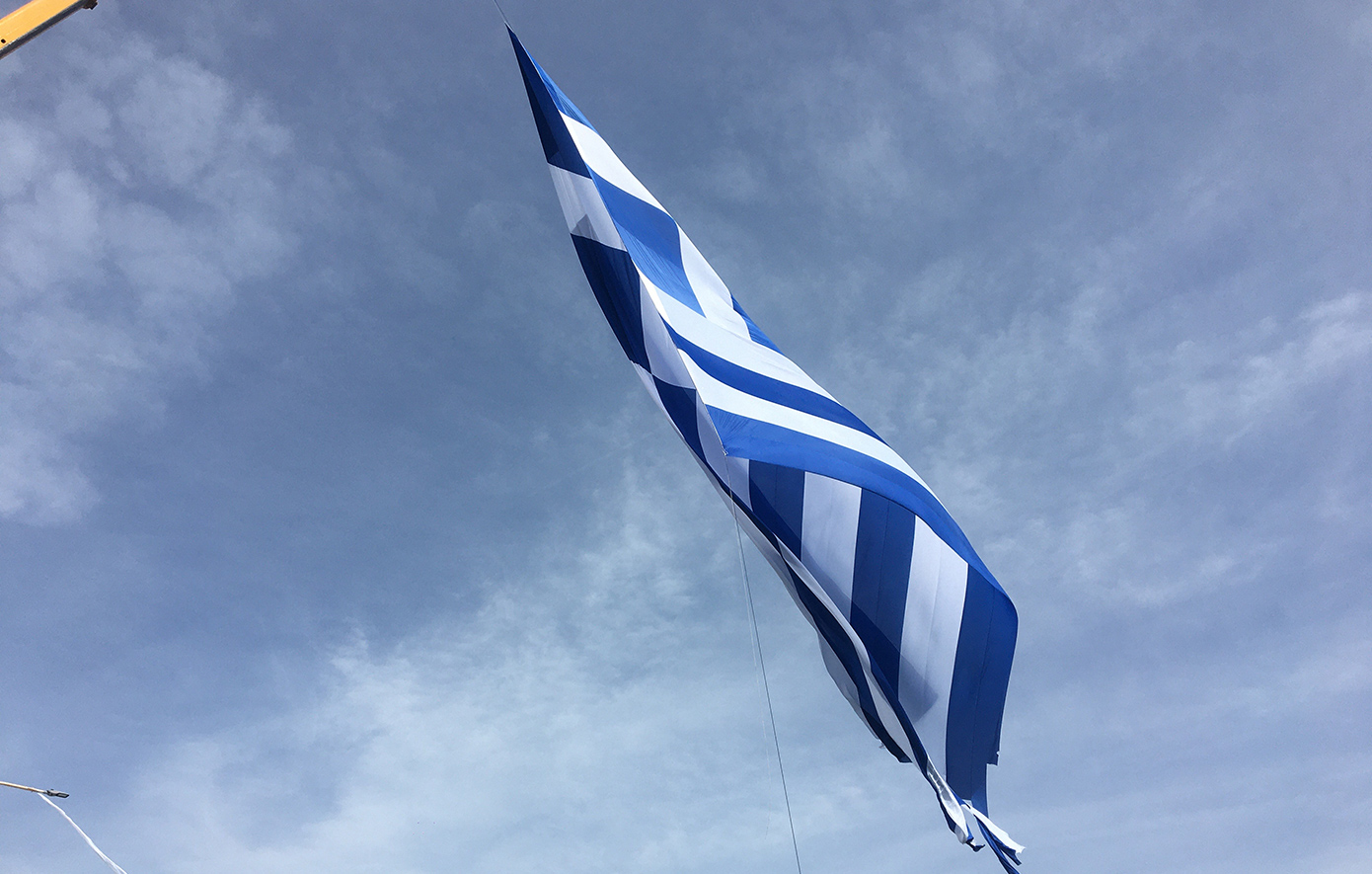 Η τεραστίων διαστάσεων σημασία, υψώθηκε με τη βοήθεια γερανού, παρουσία πλήθους κόσμου.