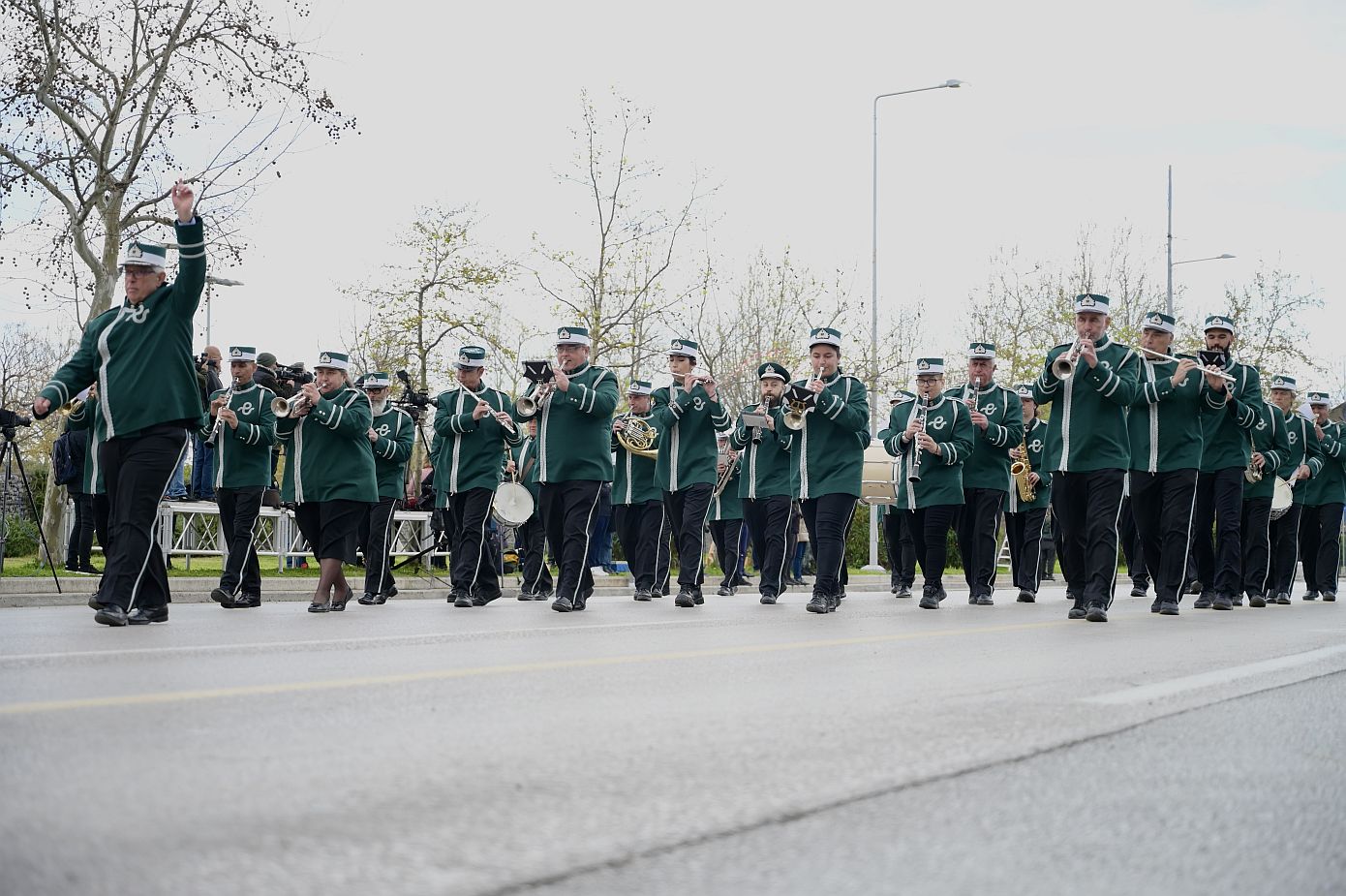 Υπό τους ήχους των εμβατηρίων της Φιλαρμονικής του δήμου Θεσσαλονίκης στην παρέλαση της 25ης Μαρτίου συμμετέχουν τμήματα σχολείων, συλλόγων, αλλά και πεζοπόρα στρατιωτικά αγήματα.