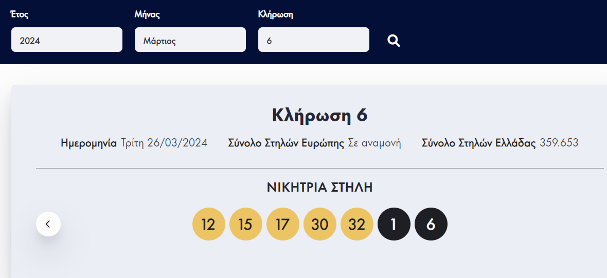 Οι τυχεροί αριθμοί είναι οι εξής: 12, 15, 17, 30, 32, 1, 6.
