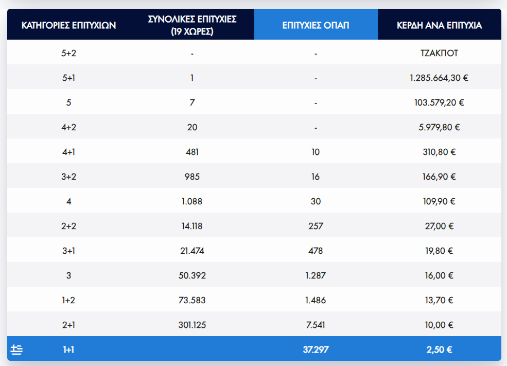 Το δελτίο του Eurojackpot περιλαμβάνει συνολικά 6 στήλες, με το κόστος κάθε μίας να ανέρχεται στα 2,5 ευρώ.