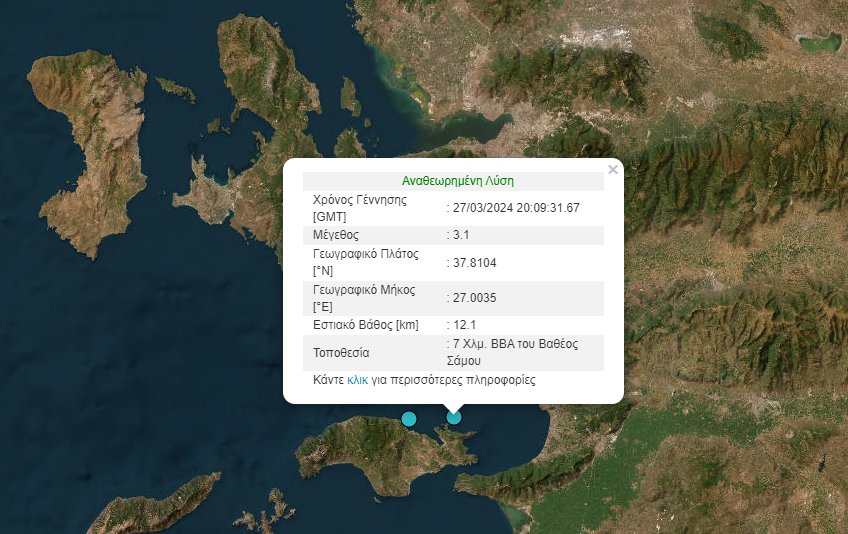 Σεισμός 3,1 Ρίχτερ σημειώθηκε στις 22:09 το βράδυ της Τετάρτης βόρεια της Σάμου.