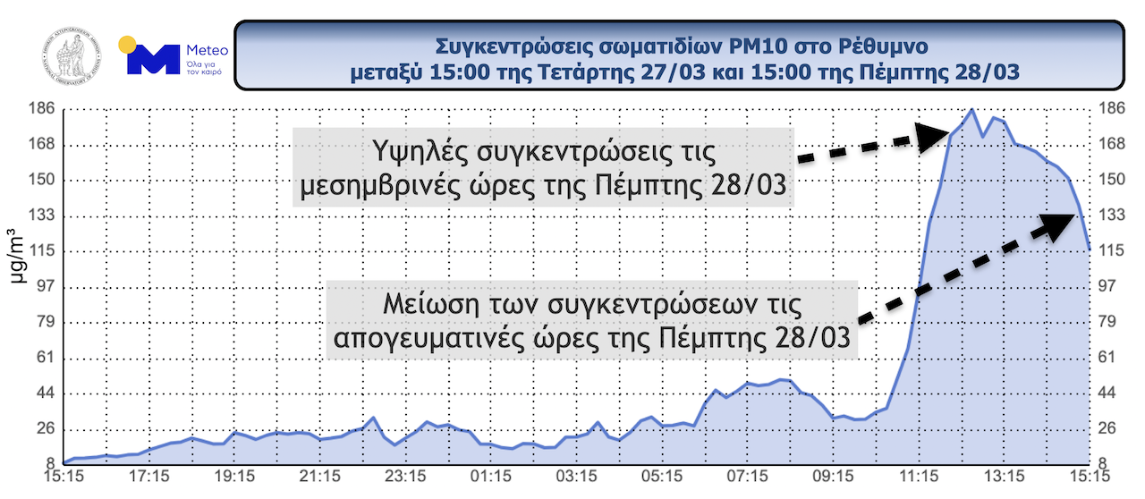 Οι συγκεντρώσεις σωματιδίων PM10 ξεπέρασαν τα 180 μg/m³ στις 12:30 και έκτοτε σταδιακά υποχωρούν, όπως αναμενόταν άλλωστε και με βάση τα προγνωστικά στοιχεία του μοντέλου μεταφοράς σκόνης DUST/METEO του Εθνικού Αστεροσκοπείου Αθηνών.