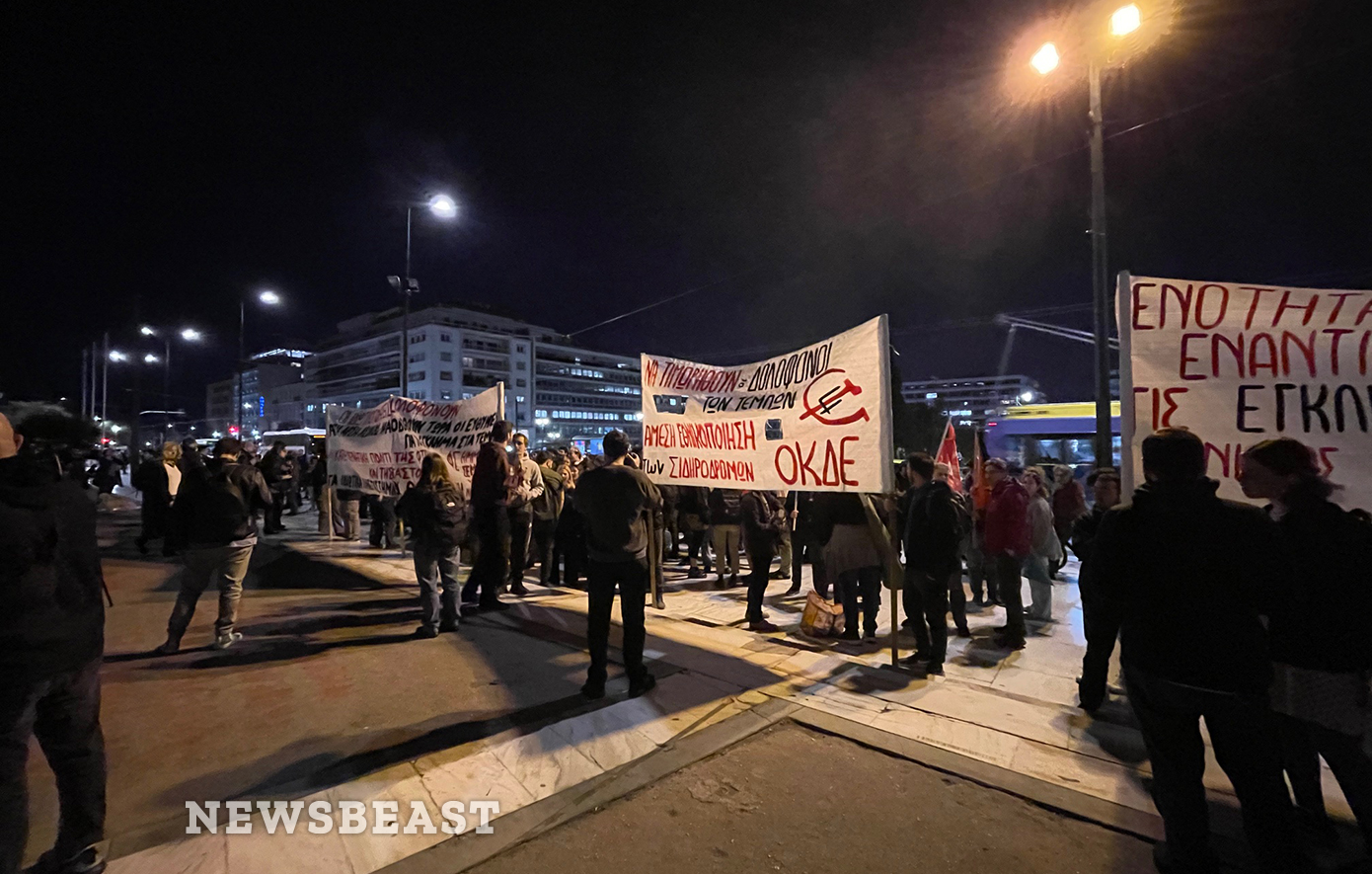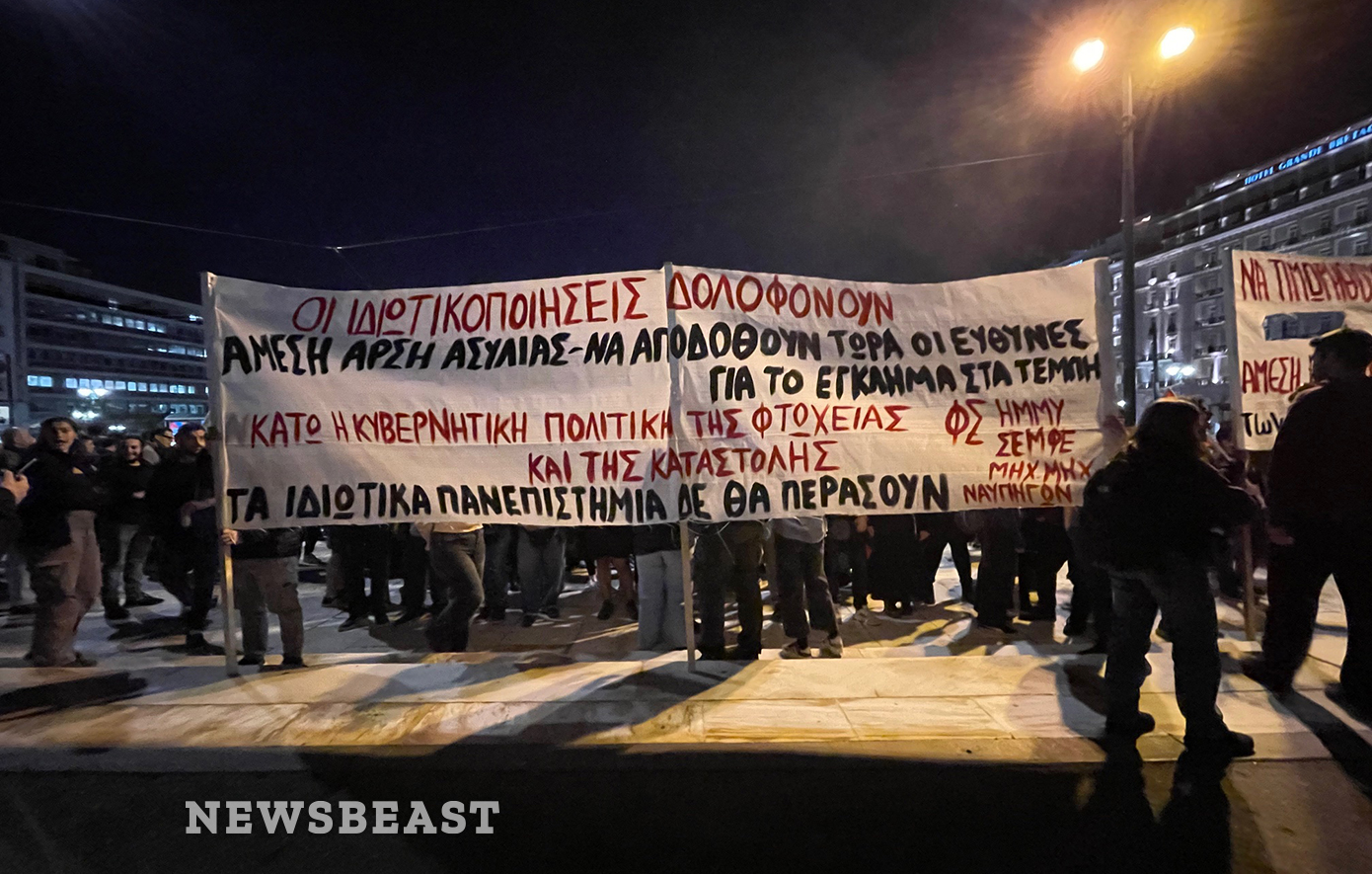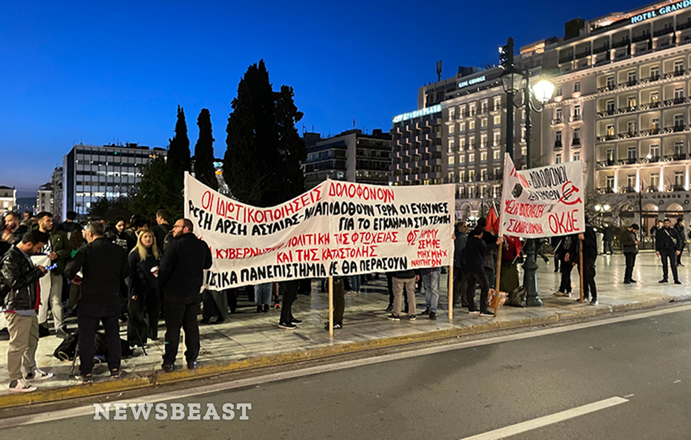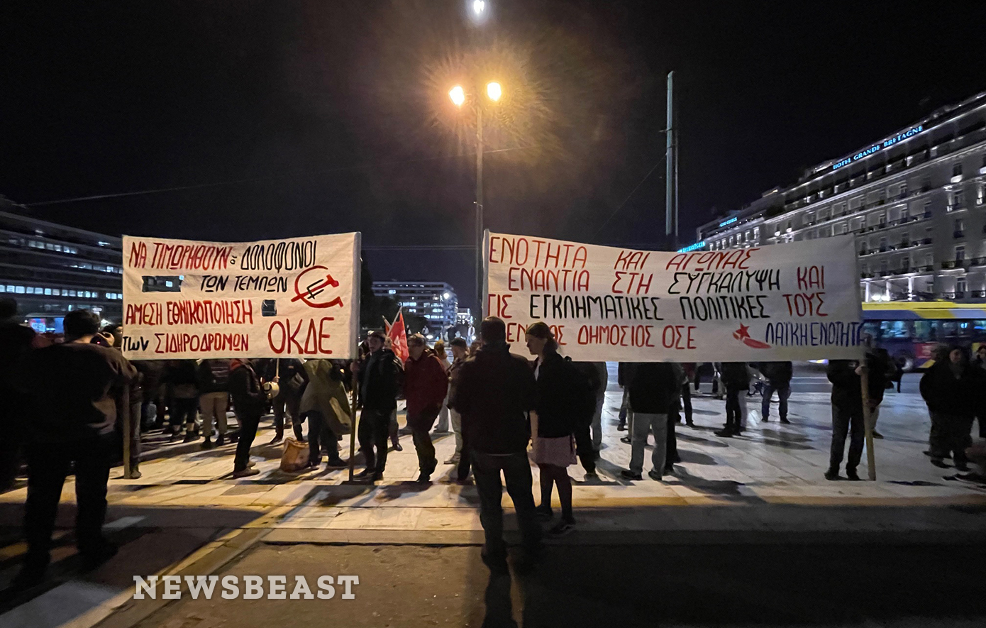 Η συγκέντρωση πραγματοποιείται την ώρα που στη Βουλή κορυφώνεται η συζήτηση της πρότασης δυσπιστίας κατά της κυβέρνησης για την υπόθεση του δυστυχήματος των Τεμπών.