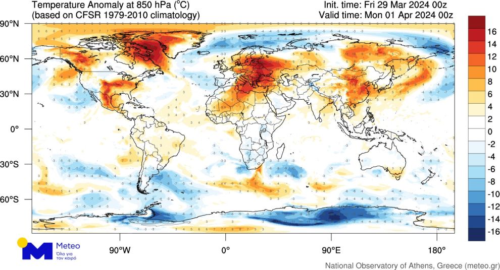 Ενδιαφέρον έχει να δούμε και την ίδια εικόνα σε παγκόσμιο επίπεδο (δεύτερος χάρτης). Πολλές περιοχές του Βορείου Ημισφαιρίου αναμένεται να έχουν την Πρωταπριλιά πολύ υψηλές θερμοκρασίες, κυρίως σε περιοχές των ΗΠΑ, στον Ανατολικό Καναδά και στη Γροιλανδία, στο μεγαλύτερο μέρος της Ευρώπης (όπως προαναφέραμε) καθώς και περιοχές της Κίνας.