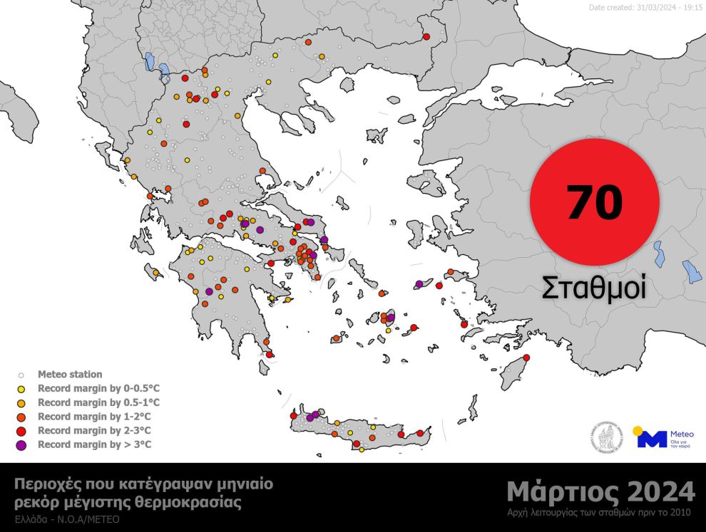 Η επιλογή των σταθμών έγινε από μετεωρολογικούς σταθμούς του δικτύου αυτόματων μετεωρολογικών σταθμών του meteo.gr / Εθνικού Αστεροσκοπείου Αθηνών με αρχή λειτουργίας από το 2010 και πριν. 70 σταθμοί σημείωσαν ρεκόρ θερμοκρασίας για μήνα Μάρτιο, από τους 128 που λειτουργούν αδιαλείπτως από πριν το 2010.