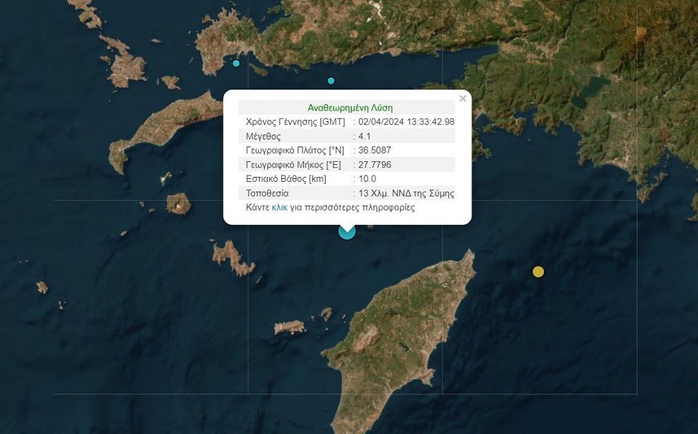 Σεισμός 4,1 Ρίχτερ σημειώθηκε στις 15:33 το μεσημέρι της Τρίτης (02/04) στο θαλάσσιο χώρο ανοιχτά της Ρόδου και πιο συγκεκριμένα 13 χιλιόμετρα νοτιοανατολικά της Σύμης.