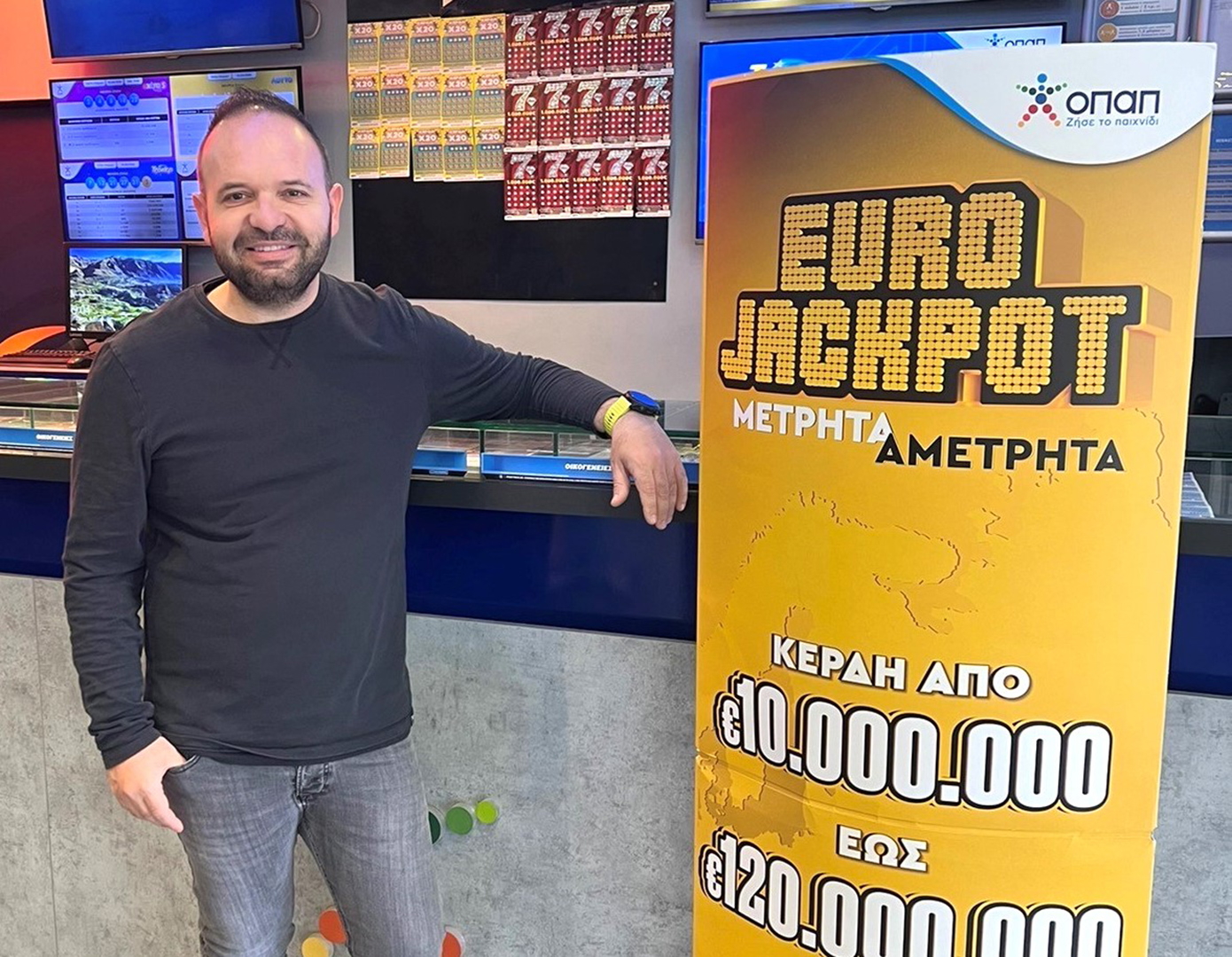 «Το έπαθλο της αποψινής κλήρωσης είναι αστρονομικό. Είναι το μεγαλύτερο ποσό που έχουν διεκδικήσει ποτέ οι Έλληνες παίκτες. Ποσά αυτού του μεγέθους μόνο το Eurojackpot μπορεί να προσφέρει. Ο καθένας σκέφτεται το πώς θα μπορούσε να αλλάξει η ζωή του αν κέρδισε ένα τέτοιο έπαθλο», αναφέρει ο Κωνσταντίνος Αγγελάτος, ιδιοκτήτης καταστήματος ΟΠΑΠ στο Περιστέρι.