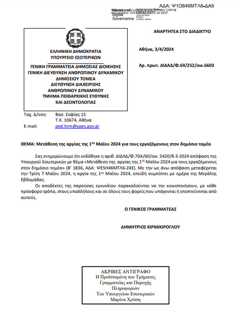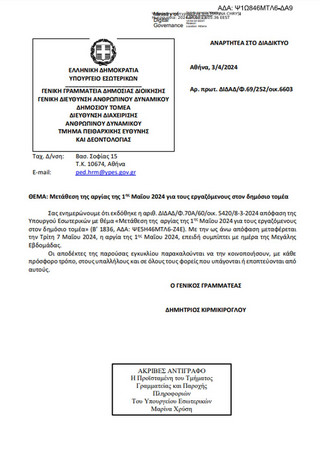 Την Τρίτη, 7 Μαΐου, μεταφέρεται η αργία της Πρωτομαγιάς για τους εργαζόμενους στον δημόσιο τομέα.