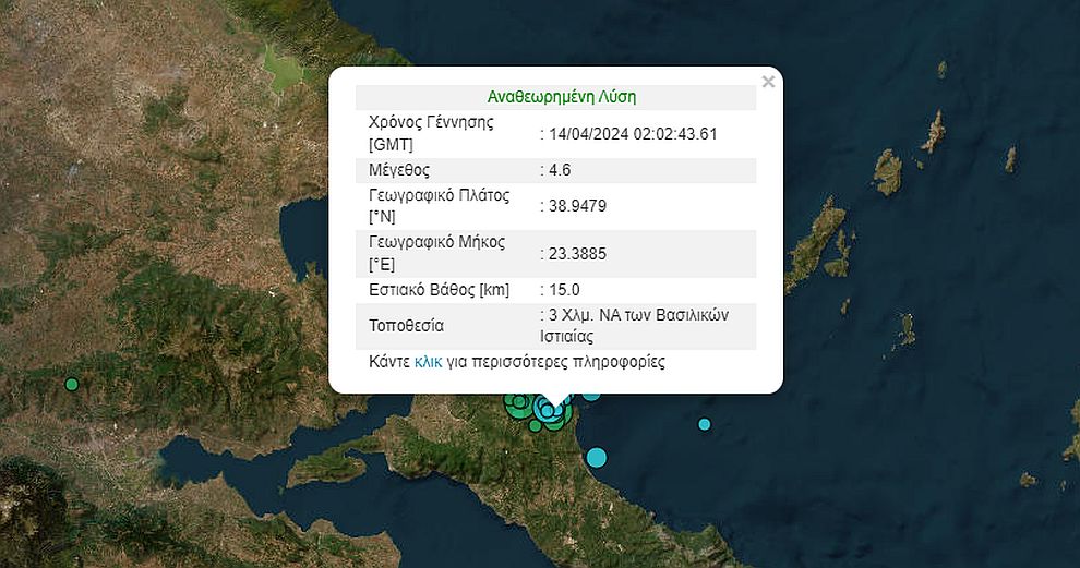 Νέα σεισμική δόνηση μεγέθους 4,6 βαθμών της κλίμακας Ρίχτερ σημειώθηκε τα ξημερώματα της Κυριακής, γυρώ στις 05:02, στην Εύβοια, σύμφωνα με το Γεωδυναμικό Ινστιτούτο του Εθνικού Αστεροσκοπείου Αθηνών, η οποία έγινε αισθητή και στην Αττική.