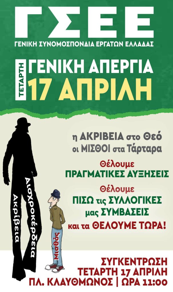 Πανελλαδική απεργία προκήρυξε η ΓΣΕΕ μεθαύριο, Τετάρτη, 17 Απριλίου, ζητώντας αυξήσεις στους μισθούς, επαναφορά των Συλλογικών Συμβάσεων Εργασίας και προστασία του εισοδήματος απο την ακρίβεια, με βασικό μήνυμα «η ακρίβεια στον Θεό, οι μισθοί στα τάρταρα. Θέλουμε πραγματικές αυξήσεις, θέλουμε πίσω τις Συλλογικές μας Συμβάσεις και τα θέλουμε τώρα».