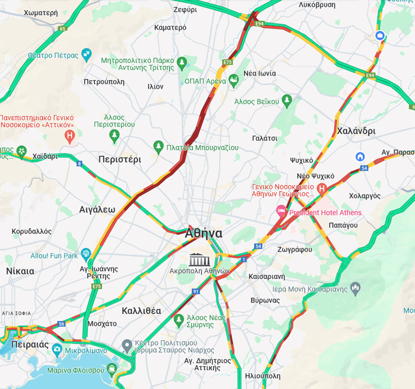 Τα μεγαλύτερα προβλήματα παρατηρούνται στην άνοδο του Κηφισού από ΚΤΕΛ έως Αχαρνών και στις εξόδους των εθνικών οδών Αθηνών-Κορίνθου και Αθηνών-Λαμίας. Παράλληλα αυξημένη είναι η κίνηση στη λεωφόρο Μεσογείων στο ρεύμα προς Αθήνα.