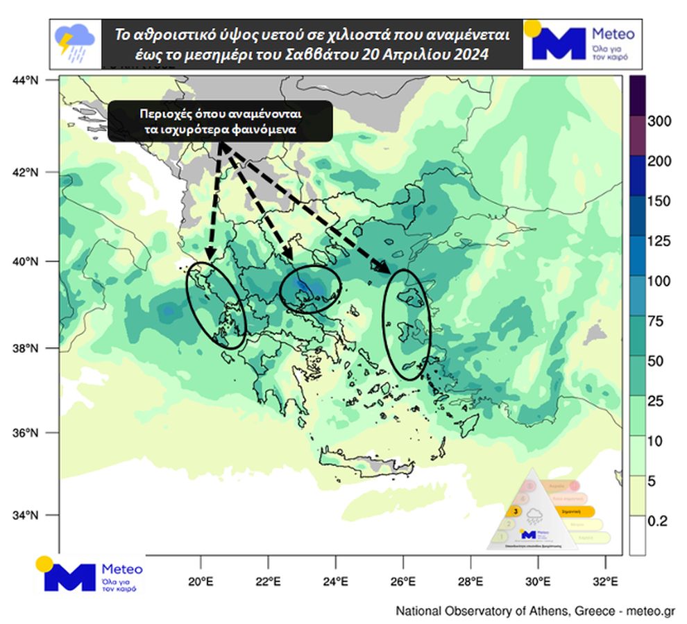 Σύμφωνα με την κατηγοριοποίηση των επεισοδίων βροχόπτωσης (Regional Precipitation Index), η οποία εφαρμόζεται από τη μονάδα Meteo του Εθνικού Αστεροσκοπείου Αθηνών, το επεισόδιο βροχόπτωσης για την Παρασκευή 19/04 κατατάσσεται στην Κατηγορία 3 (Σημαντική). Στον χάρτη που ακολουθεί παρουσιάζεται το αθροιστικό ύψος υετού σε χιλιοστά που αναμένεται έως το μεσημέρι του Σαββάτου 20/04.