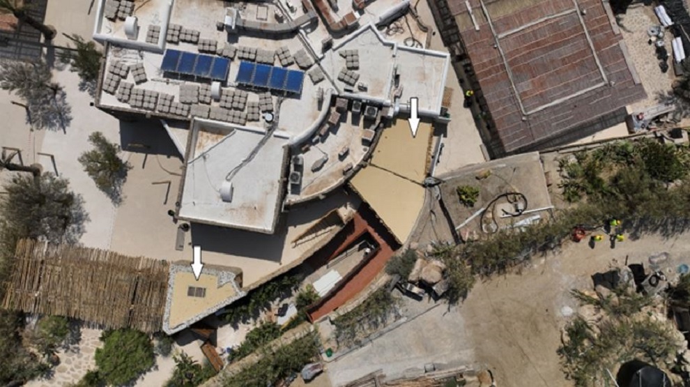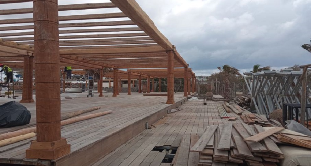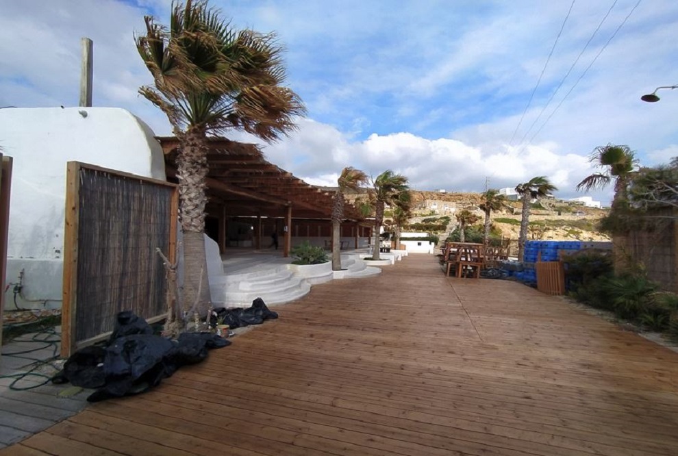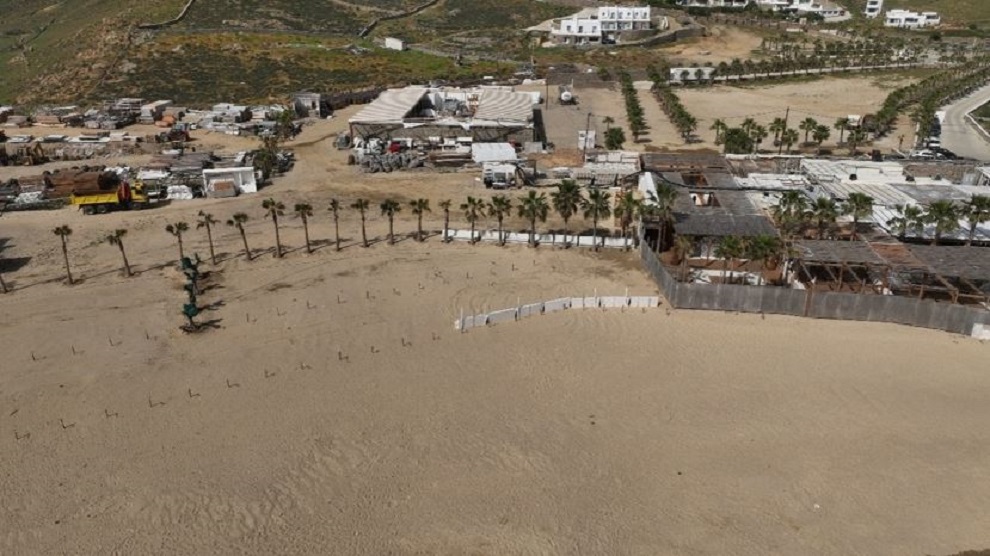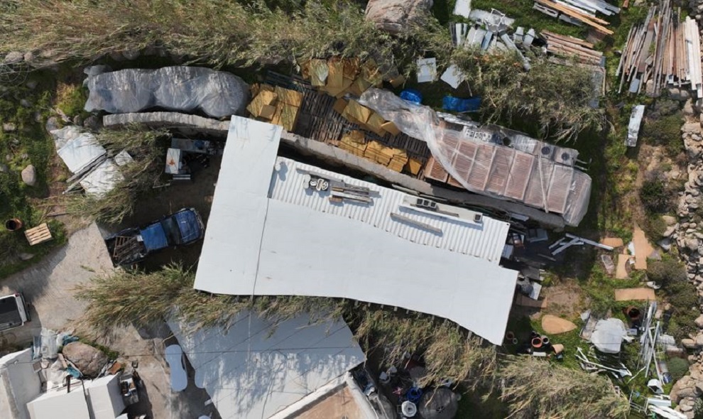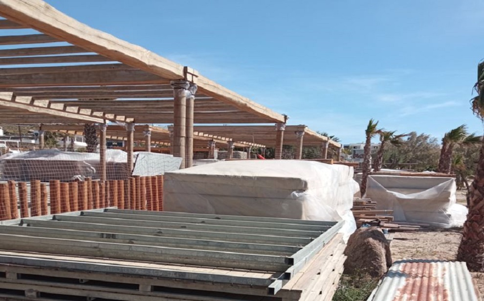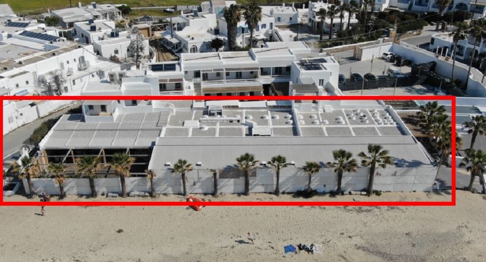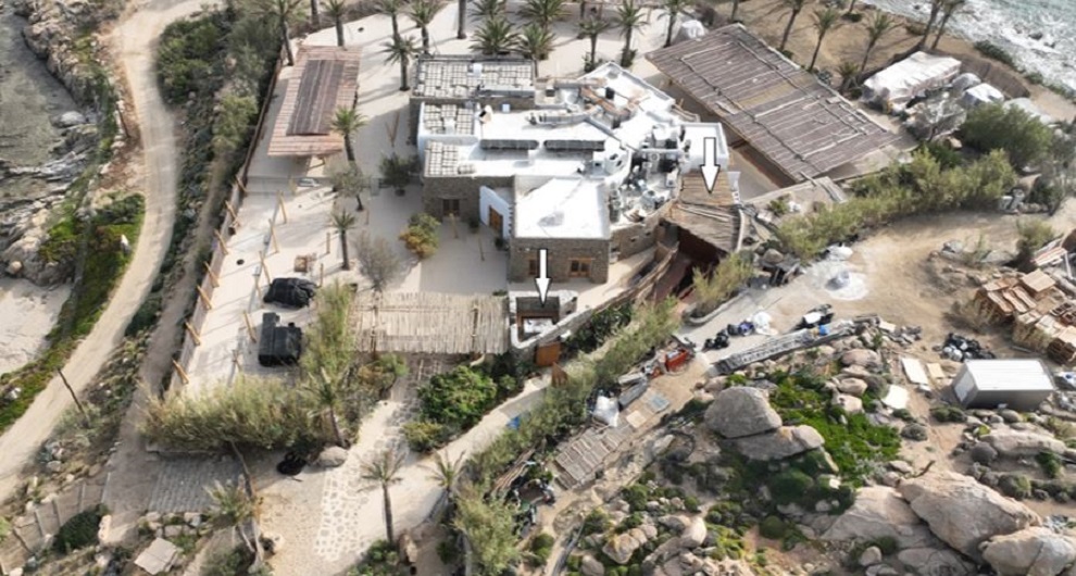 Κατά την αυτοψία του Απριλίου του 2023, εντοπίστηκαν αυθαίρετες κατασκευές, κυρίως βοηθητικής χρήσης, ως αποθηκευτικοί χώροι και προσθήκες κατ’ επέκταση κτιρίων συνολικής επιφάνειας 970 τ.μ., καθώς και κατασκευές/διαμορφώσεις έμπροσθεν του καταστήματος εντός αιγιαλού/παραλίας.